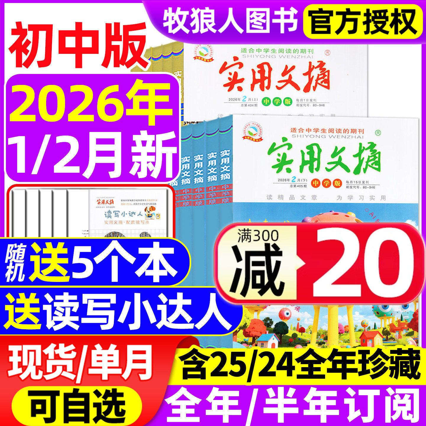 📚 实用文摘中学版初中版2026年1/2月/全年/半年订阅/2025/2024全年/15周年ABCD/7-9年级初中生中考高分作文素材杂志青少年过刊