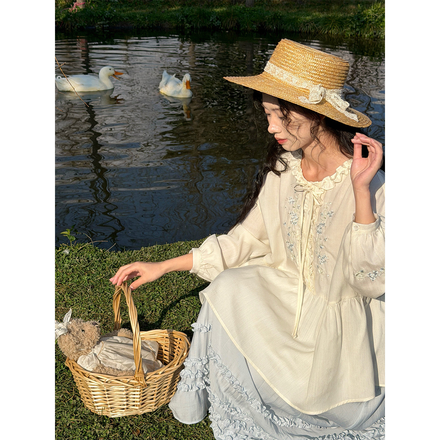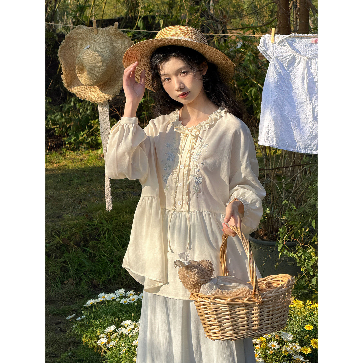📚 七与珍珠“花田野餐会”日系小清新宽松文艺木耳边刺绣上衣半裙