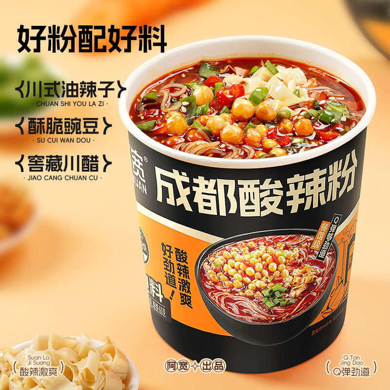 🍜首先,这款酸辣粉的包装设计超级有特色,让人一眼就爱上。杯装设计,方便携带,随时随地都能满足你的口腹之欲。而且,冲泡即食,无需油炸,超级健康!