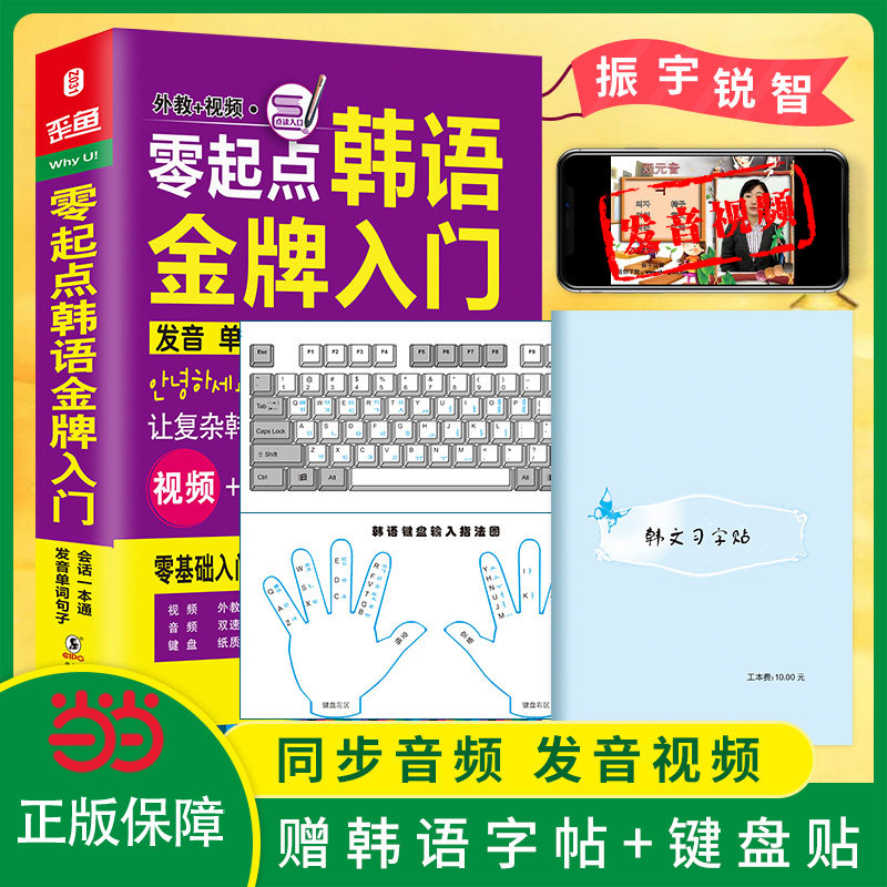 📚 当当网官方旗舰店 韩语零基础自学入门教材 零起点韩语金牌入门:发音单词句子会话一本通(外教+视频+双速音频+韩语字帖+键盘贴)