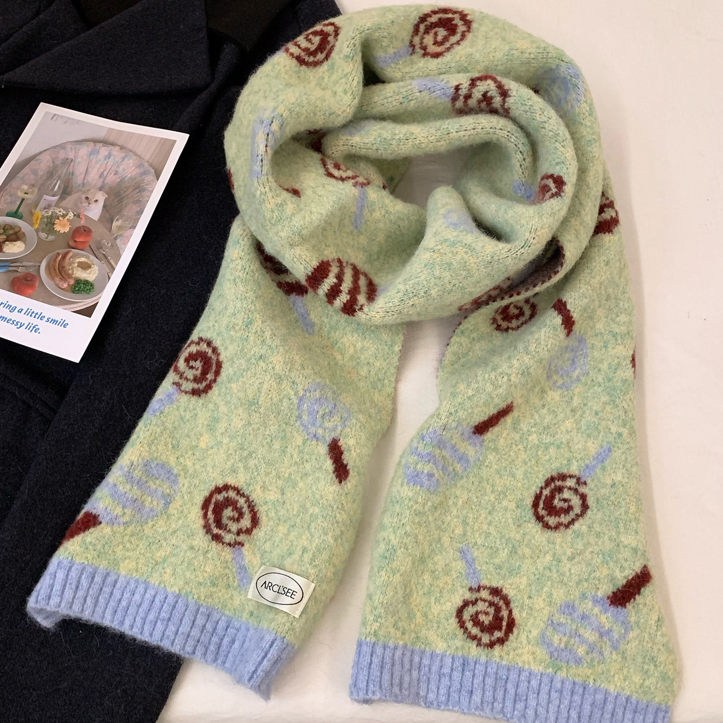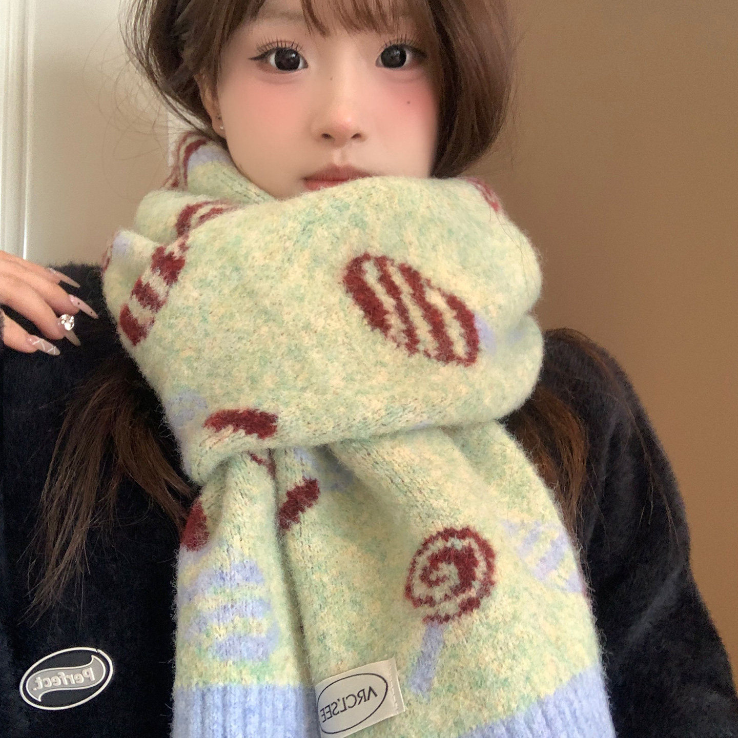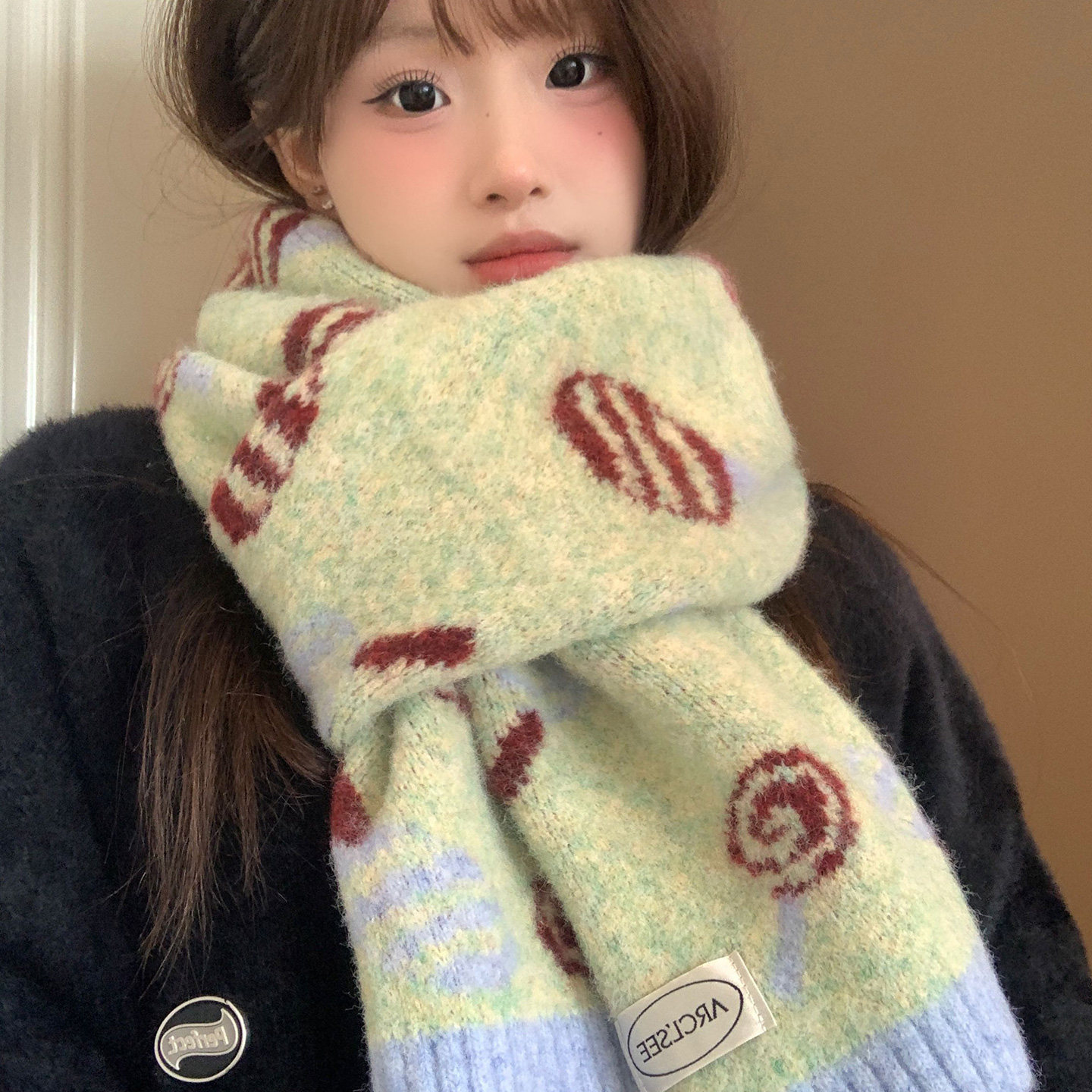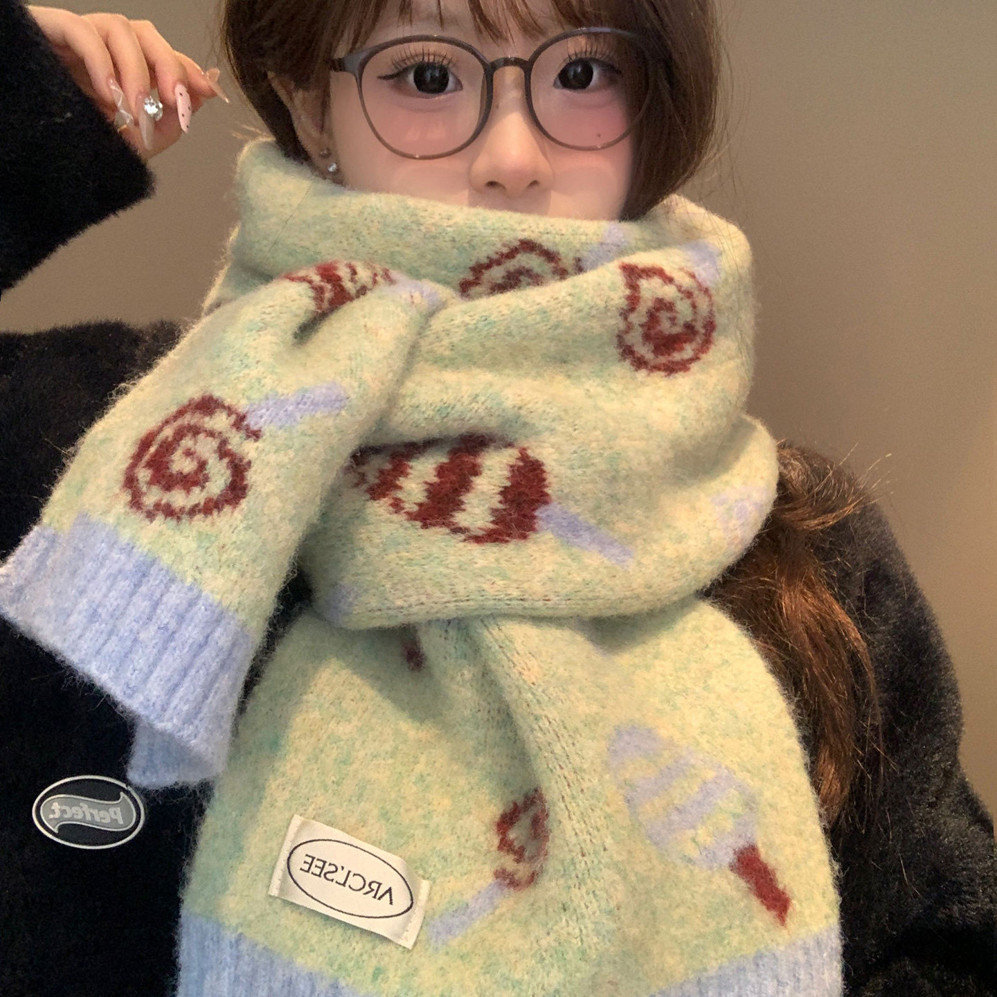 📚 可爱绿色糖果提花针织围巾女2025新款冬季韩系氛围感加厚保暖围脖