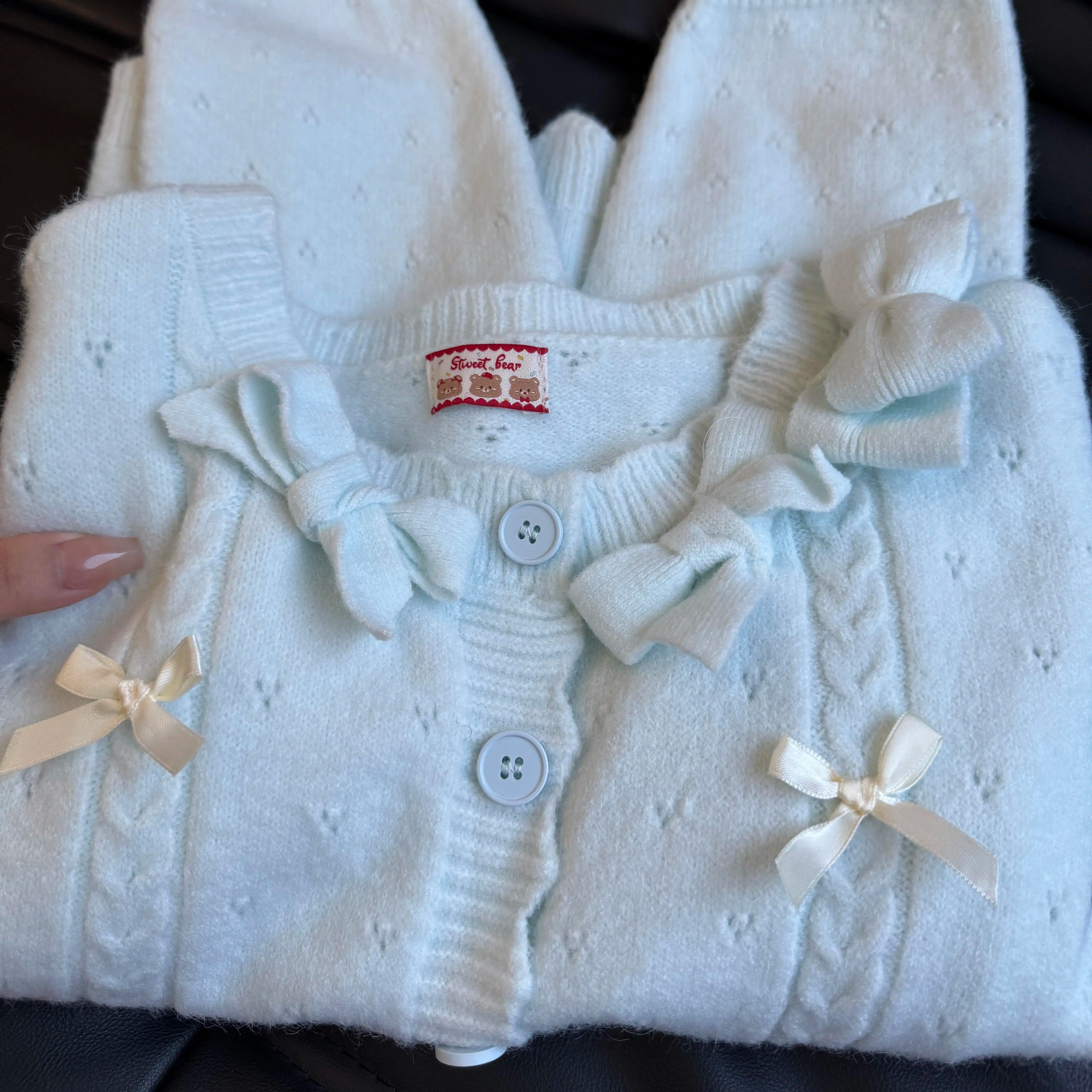 📚 KFCAG 蓝色蝴蝶结圆领毛衣女秋季气质甜美设计感小个子开衫上衣