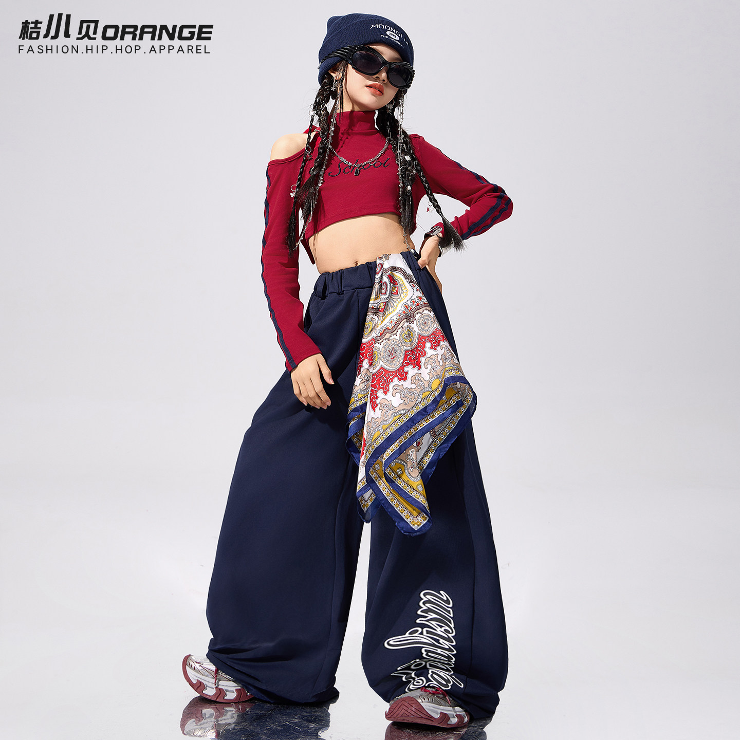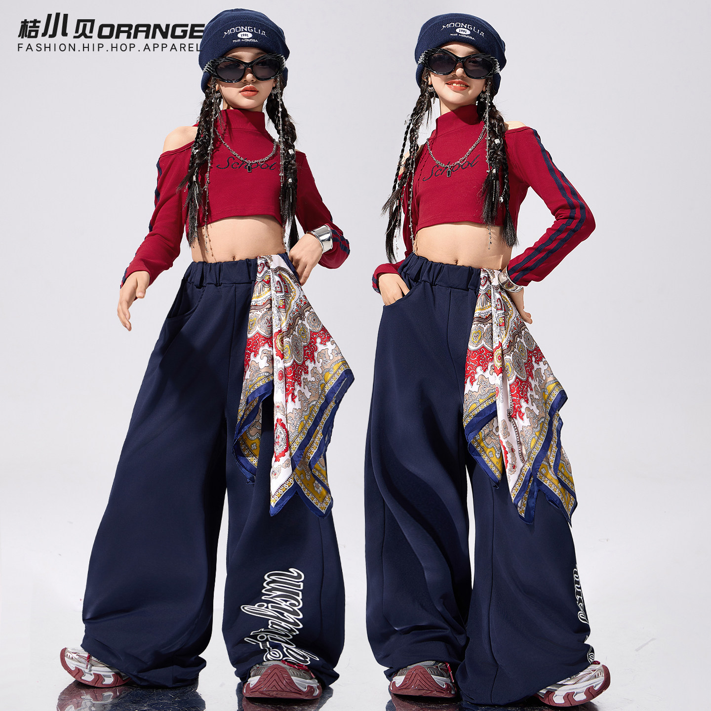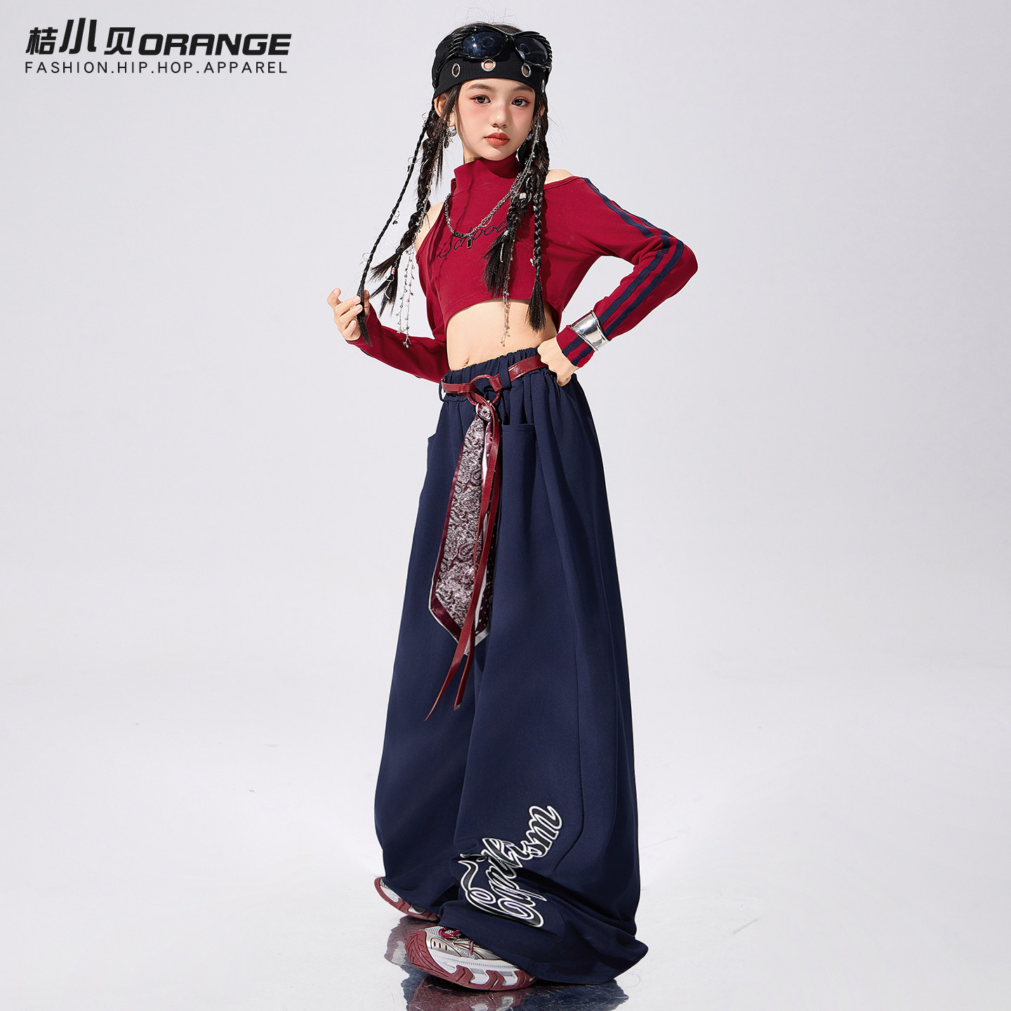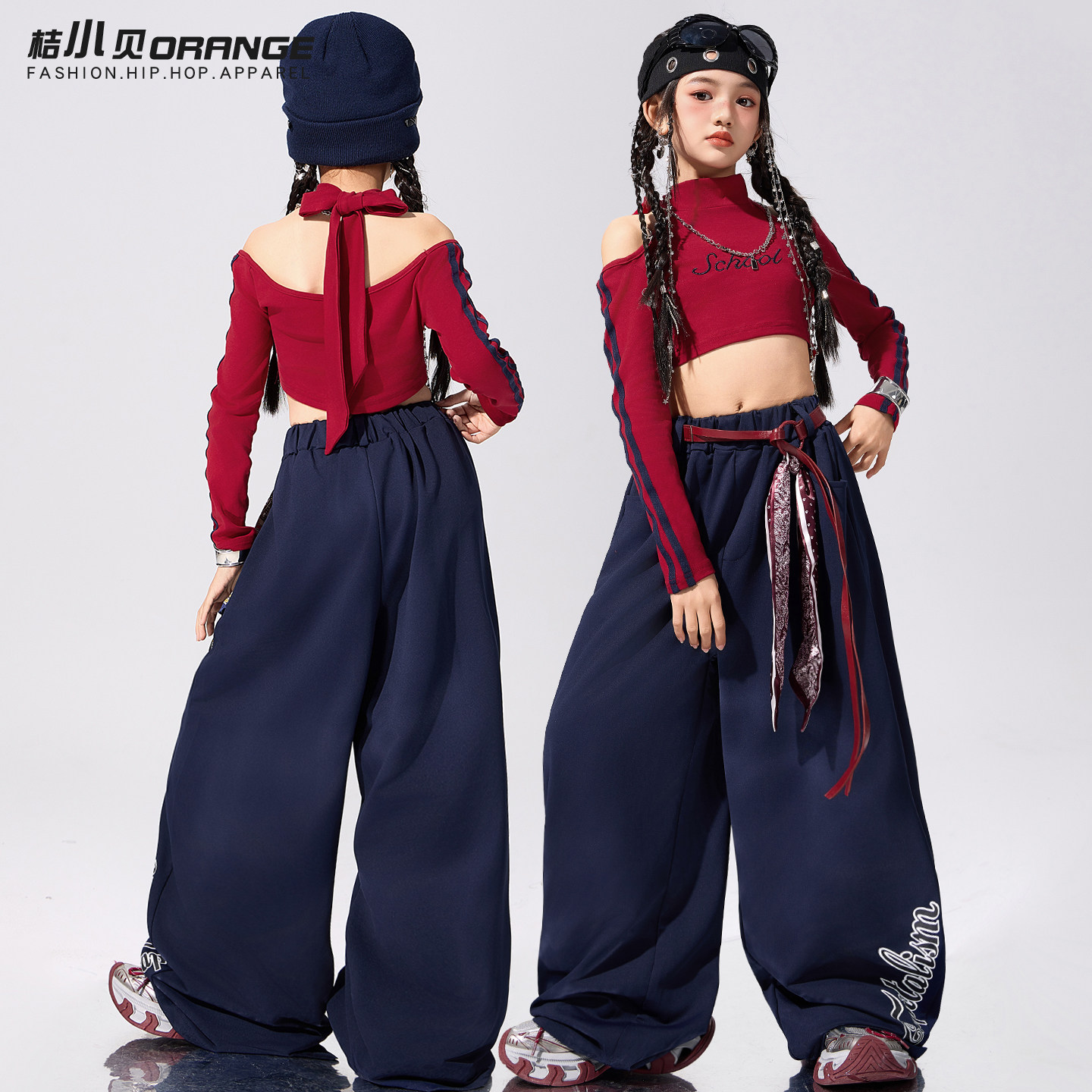 📚 女童爵士舞服装走秀潮酷炸街红色上衣套装露脐女孩街舞潮服表演服