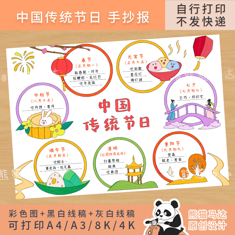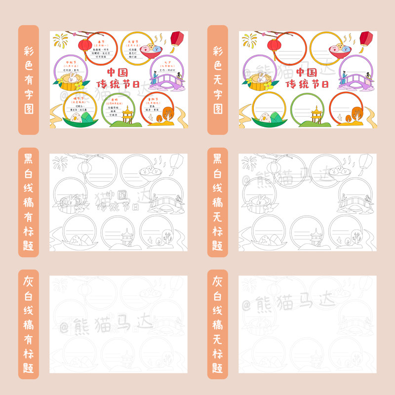 📚 257 熊猫马达 中国传统节日习俗手抄报二三年级中华传统节日线稿