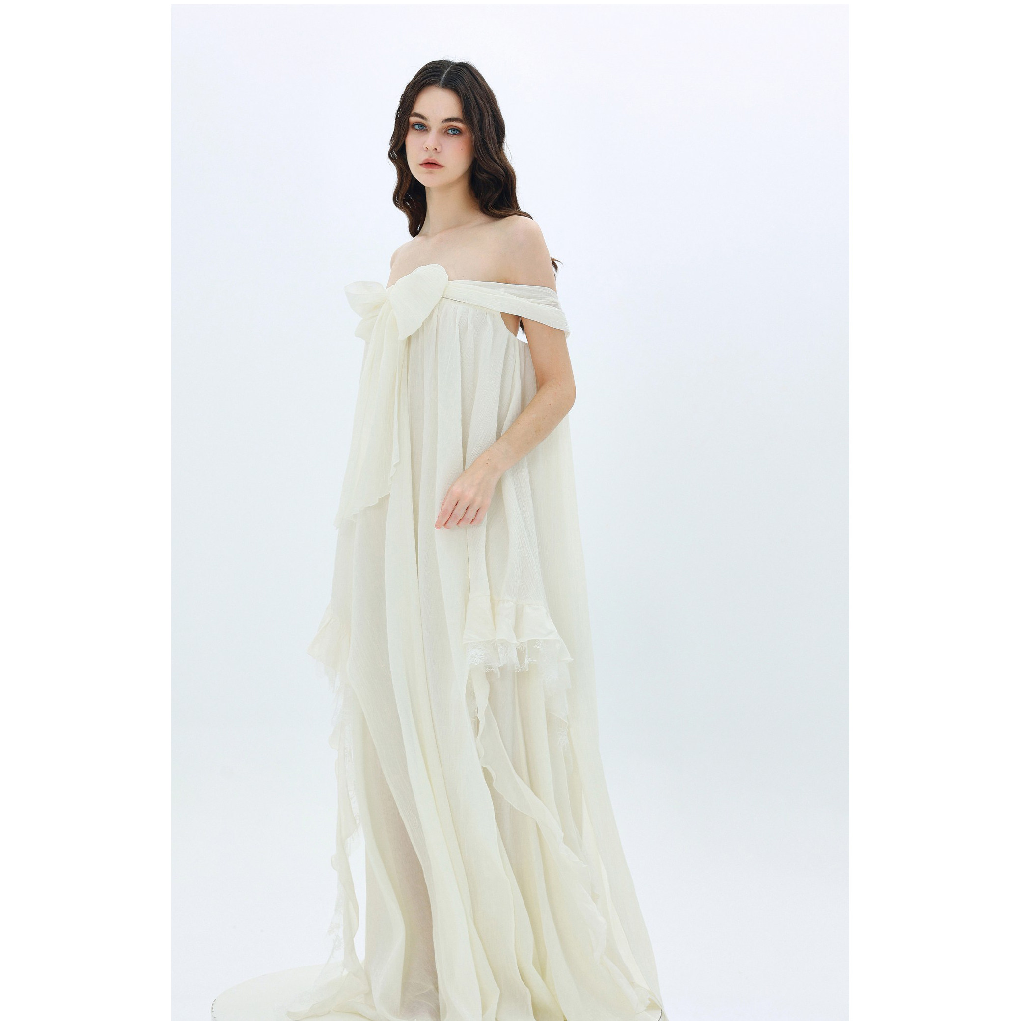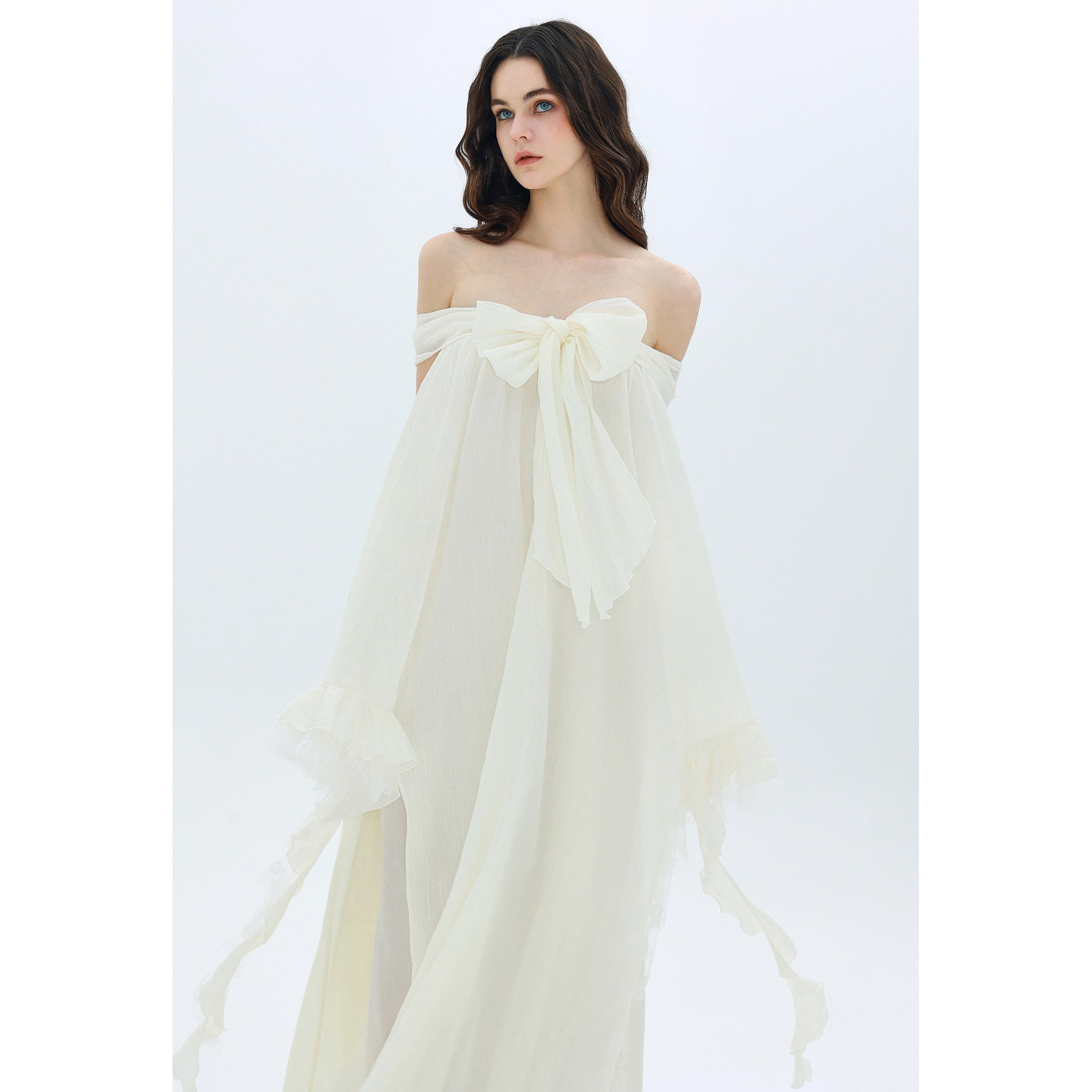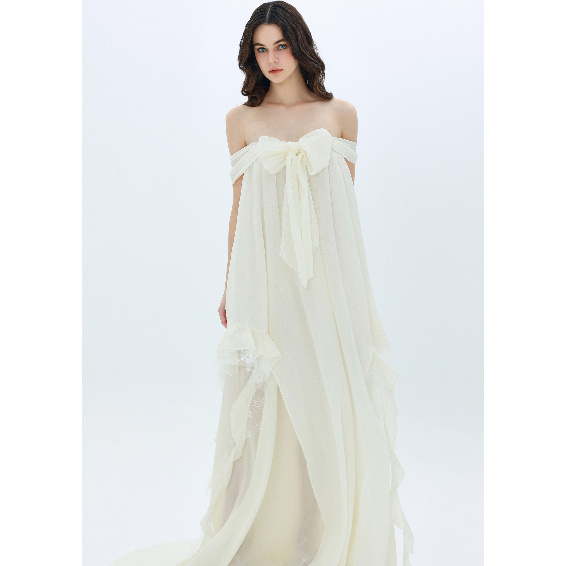 📚 MOOD X MIURA Ellery 白色褶皱蝴蝶结蕾丝荷叶边连衣裙