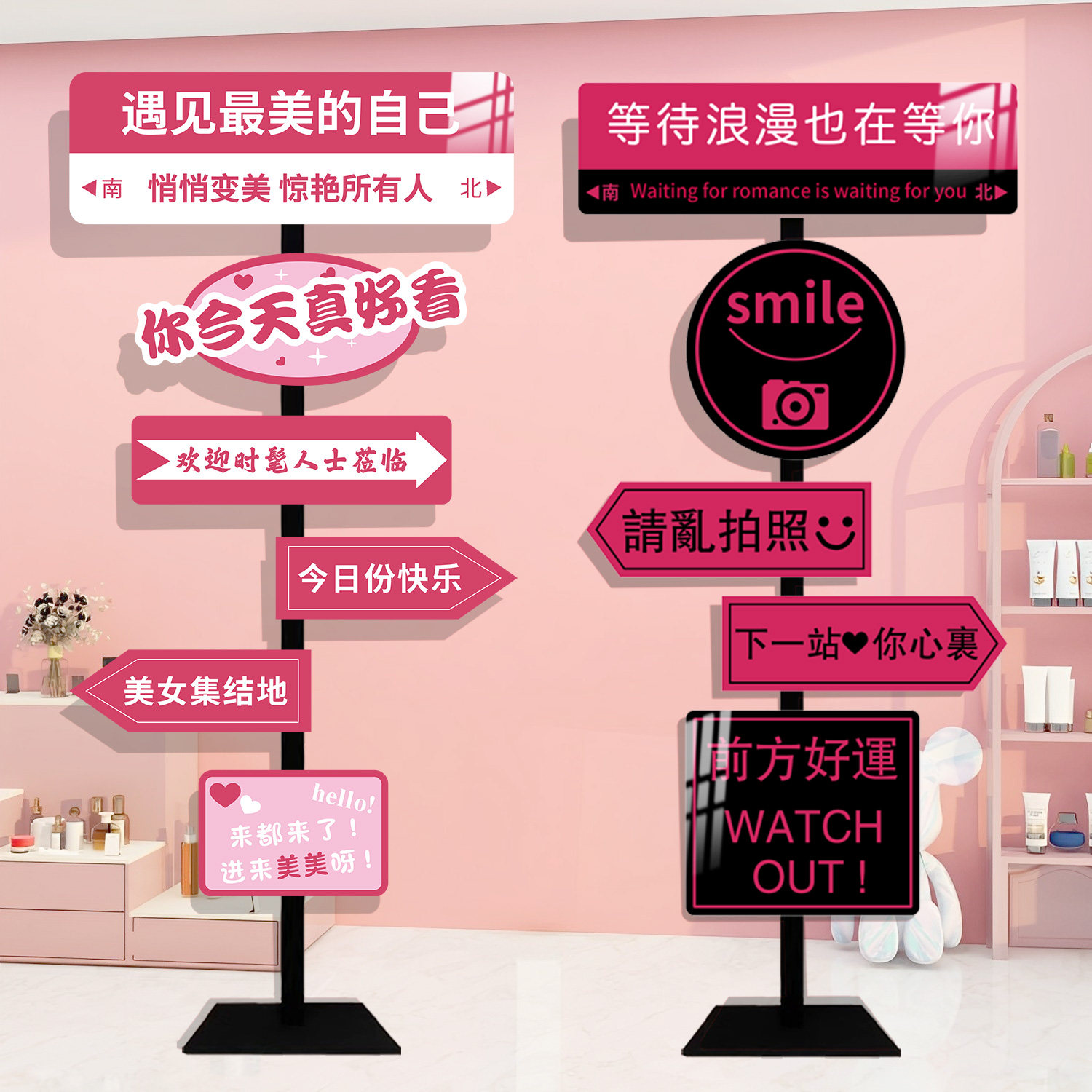 📚 网红拍照区布置美容院店门口装饰吸引人指示打卡路牌背景墙贴摆件