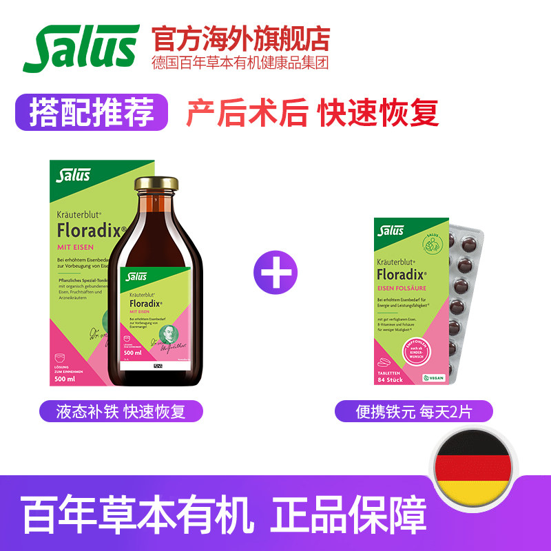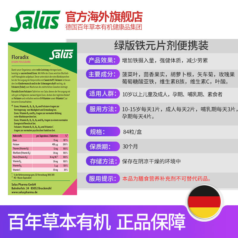 📚 Salus莎露斯便携铁元片剂绿女补铁片孕妇补铁铁元素铁剂叶酸84粒