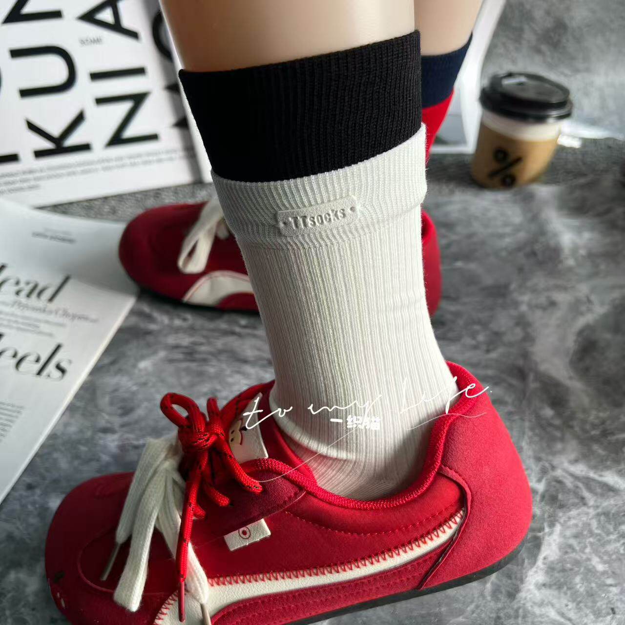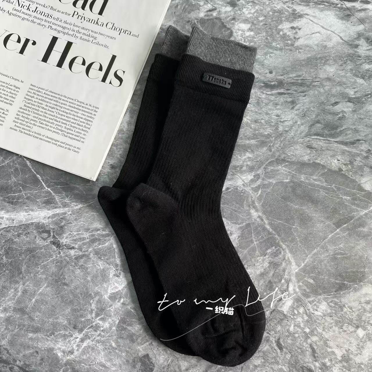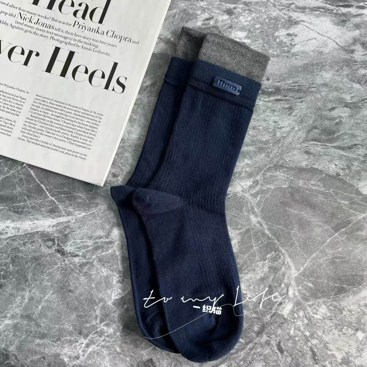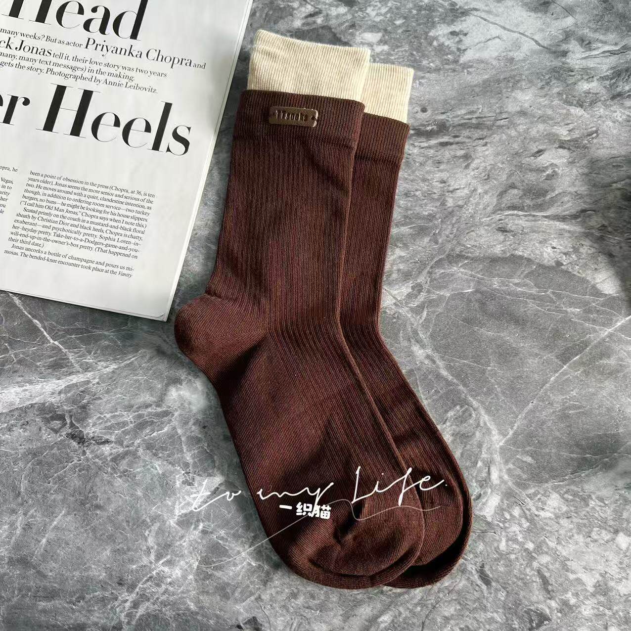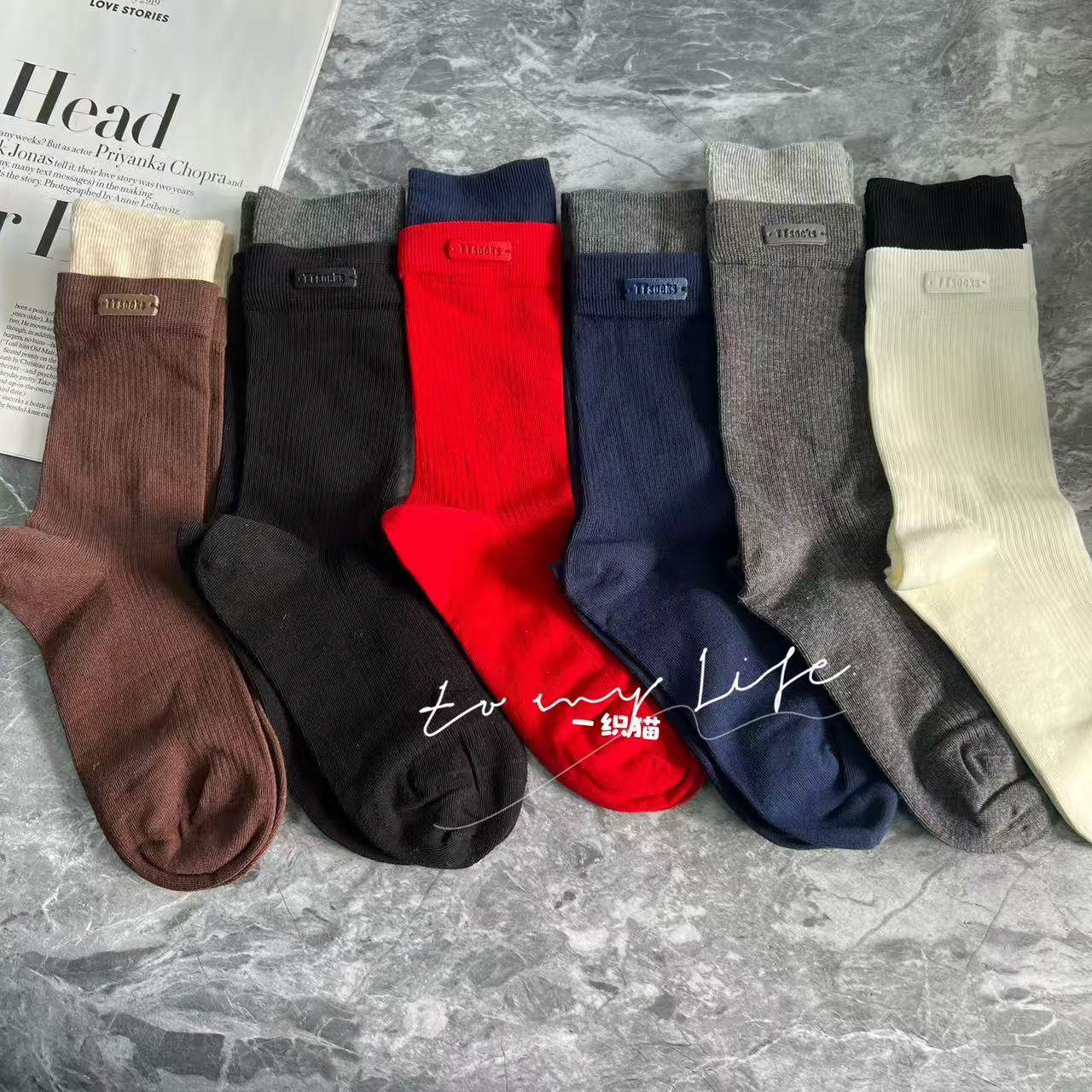 📚 欧货高品质皮标字母藏青色咖色双罗口袜子女网红同款潮袜中筒袜