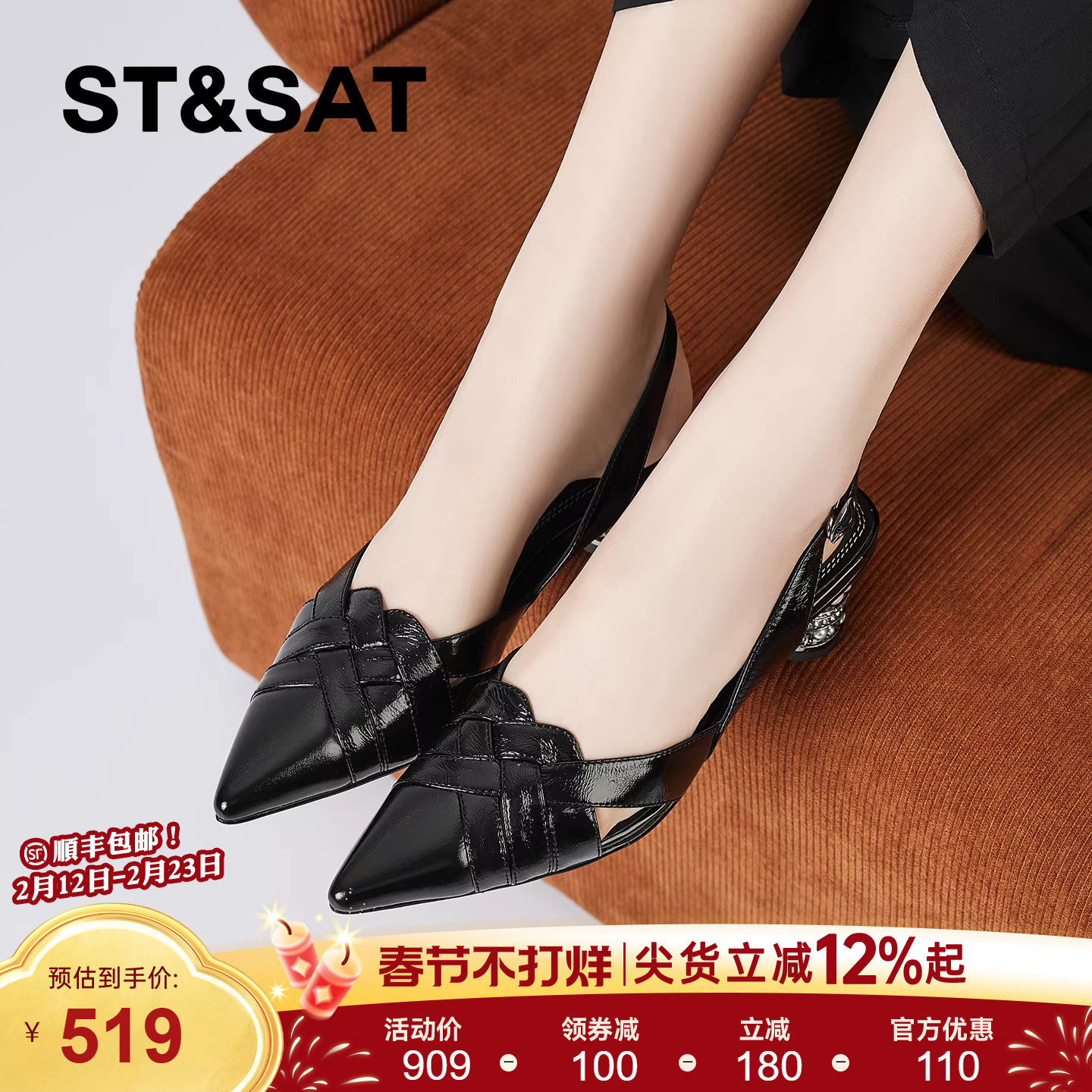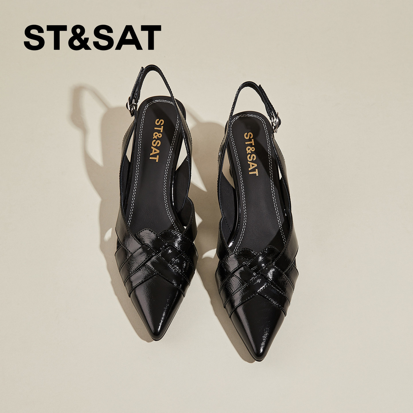 📚 星期六真皮粗跟单鞋女款夏季新款一字扣带高跟小皮鞋包头凉鞋