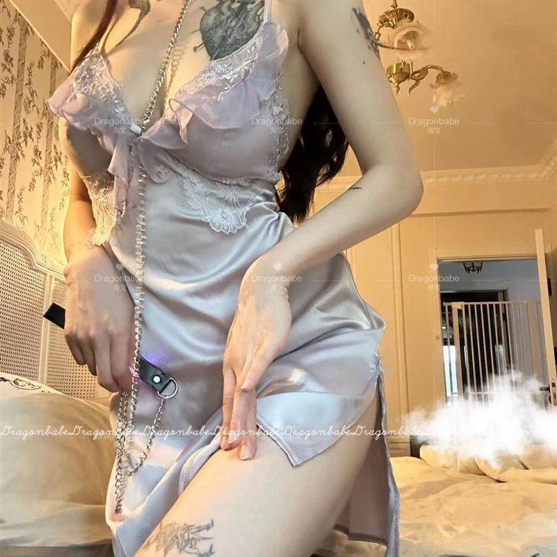 📚 Dragonbabe:“温柔陷阱”浅紫刺绣蕾丝花边缎面吊带开叉睡裙