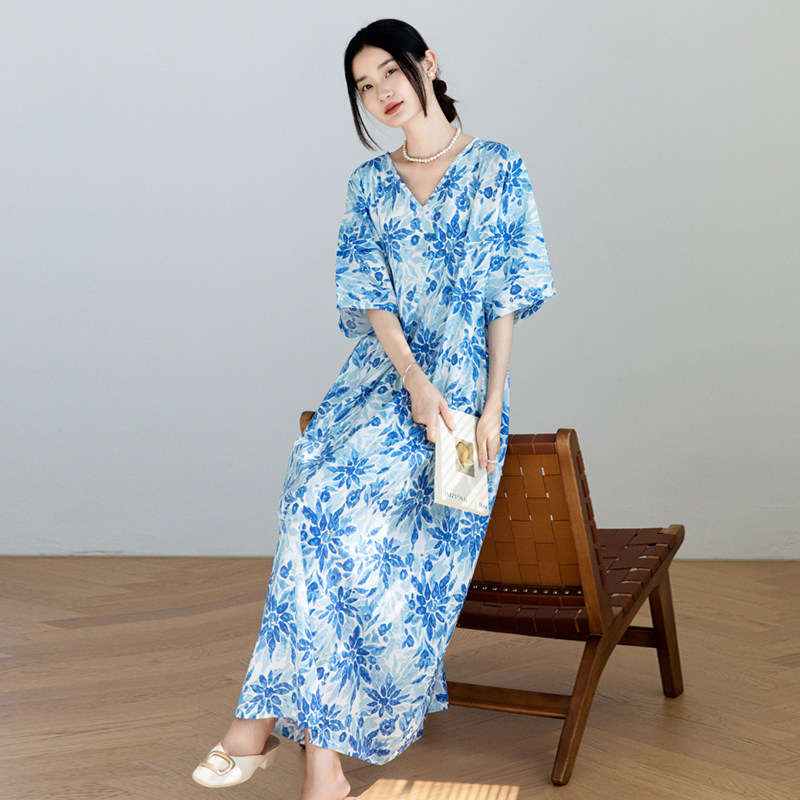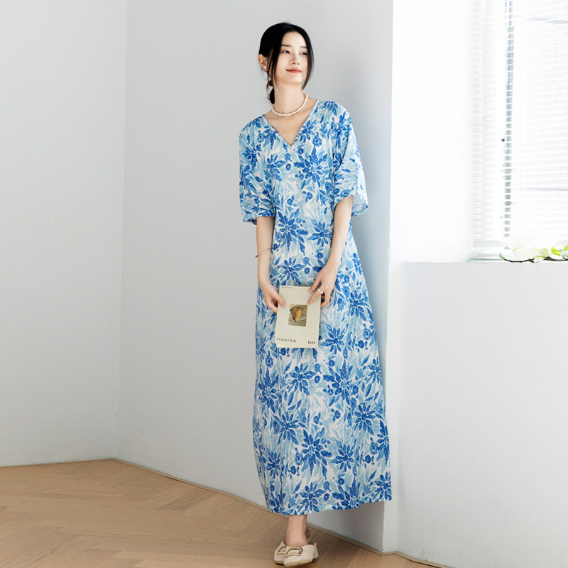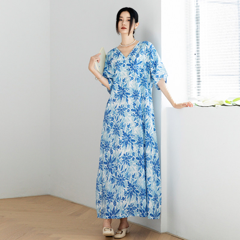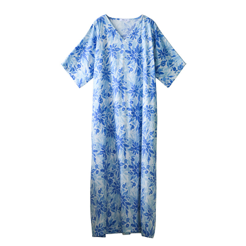📚 文艺简约气质蓝花纯棉袍子连衣裙夏原创设计 宽松大码显瘦长裙女