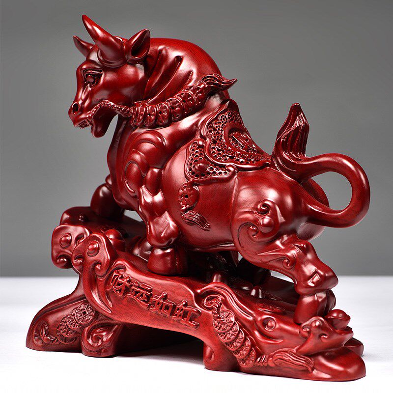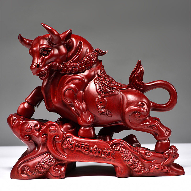 📚 红色木牛摆件中式实木雕刻红木质华尔街牛客厅补角装饰送礼工艺品
