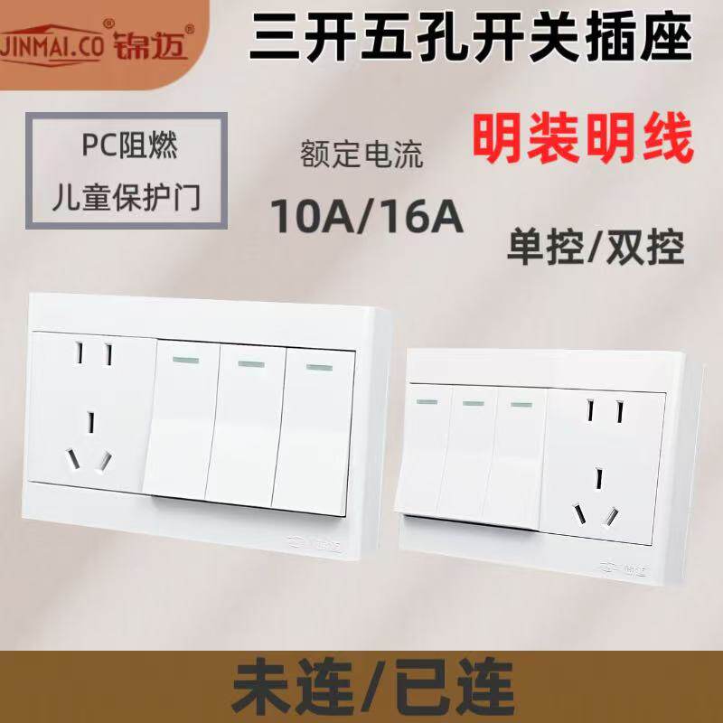 📚 锦迈超薄10A白明装-三开五孔带开关插座面板单双控电源插座带线盒