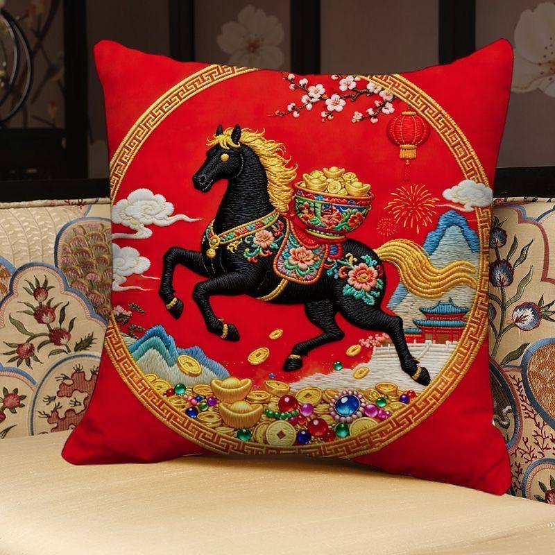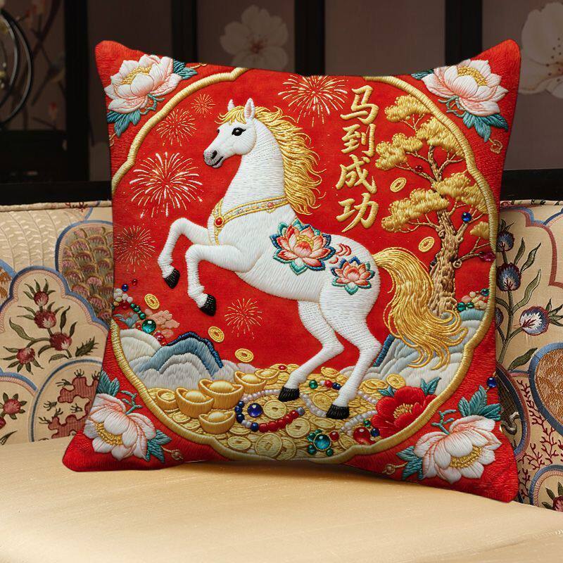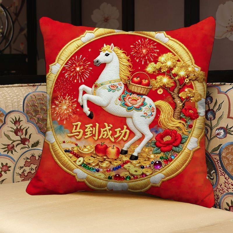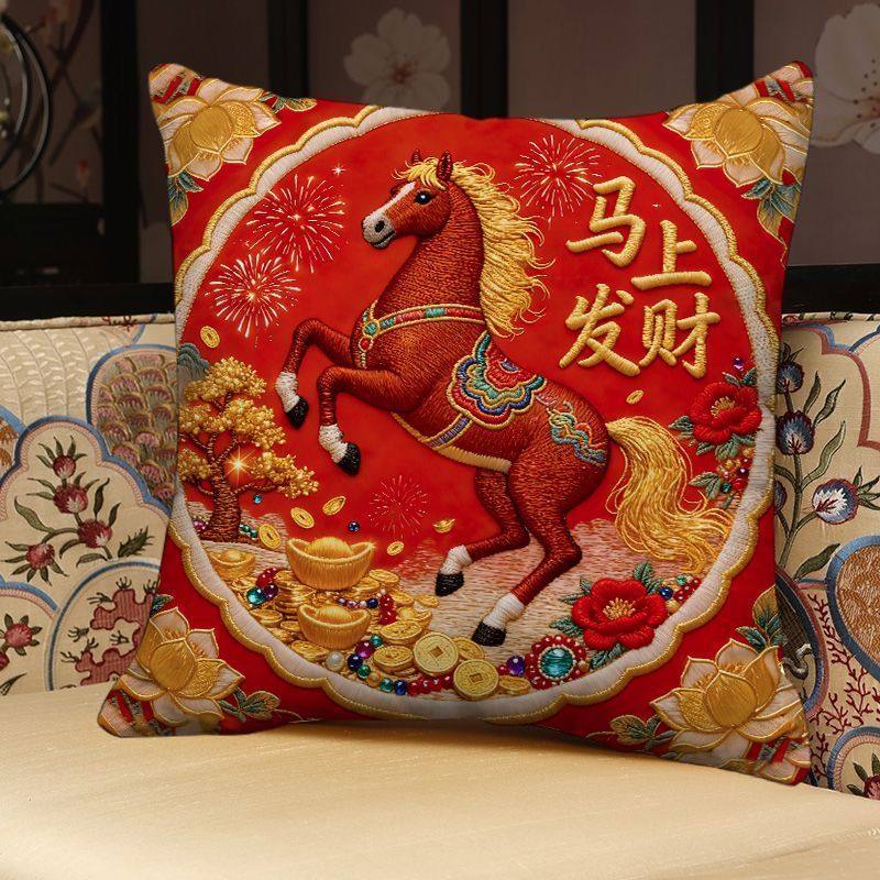 📚 新款马年抱枕马上发财新年装饰靠垫金马送福平面印花沙发靠枕