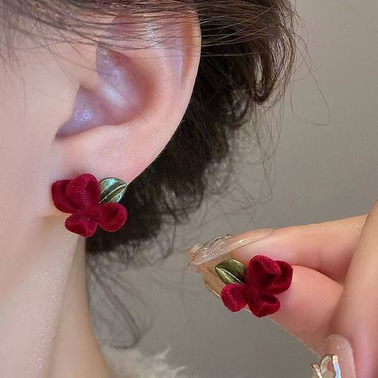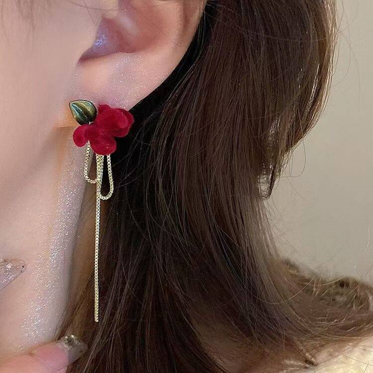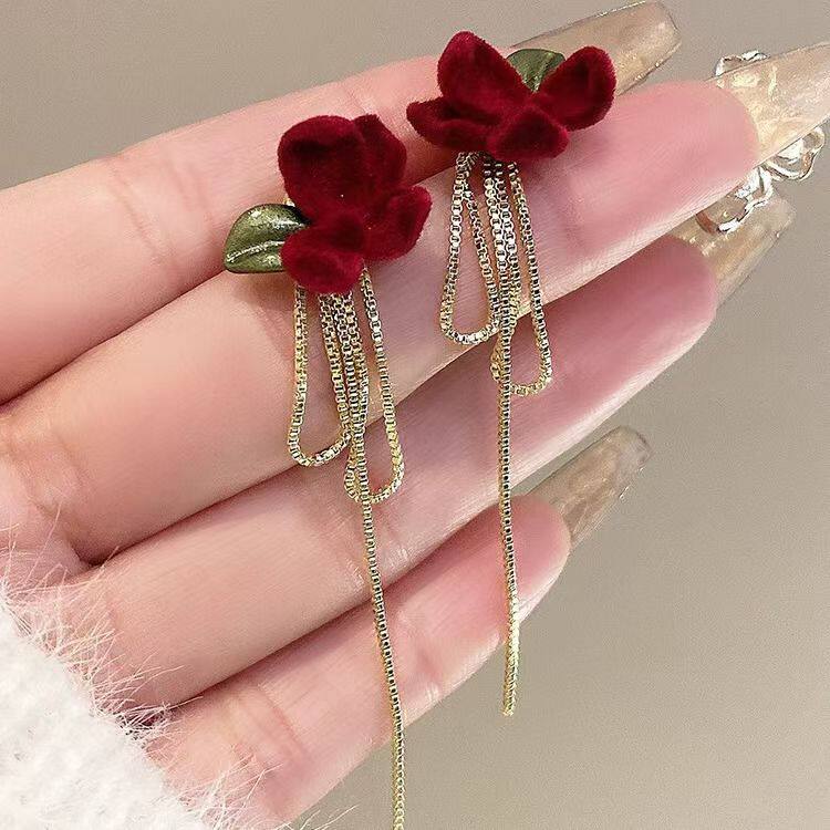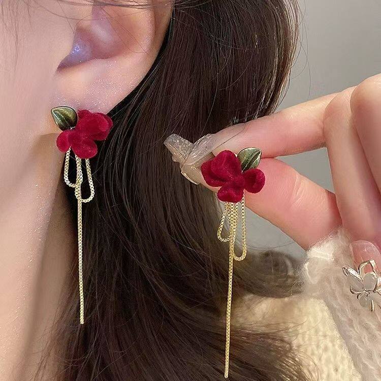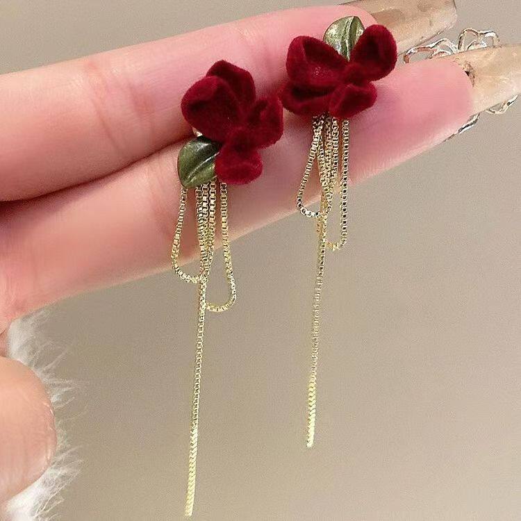 📚 山茶花长款红色丝绒流苏耳钉女秋冬轻奢高级感银针耳环气质耳饰品