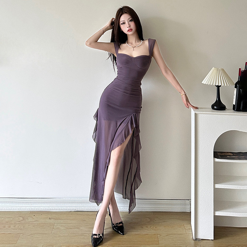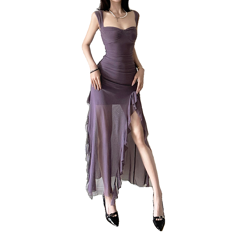 📚 #Sisjuly# 冷艳气质御姐雾霾紫荷叶边开衩性感吊带裙女 掐腰长裙