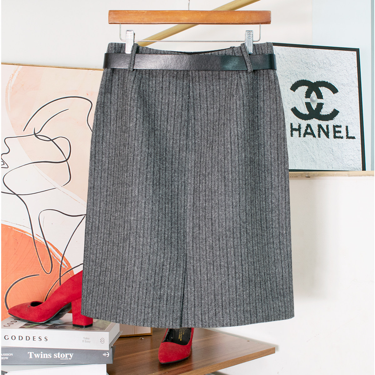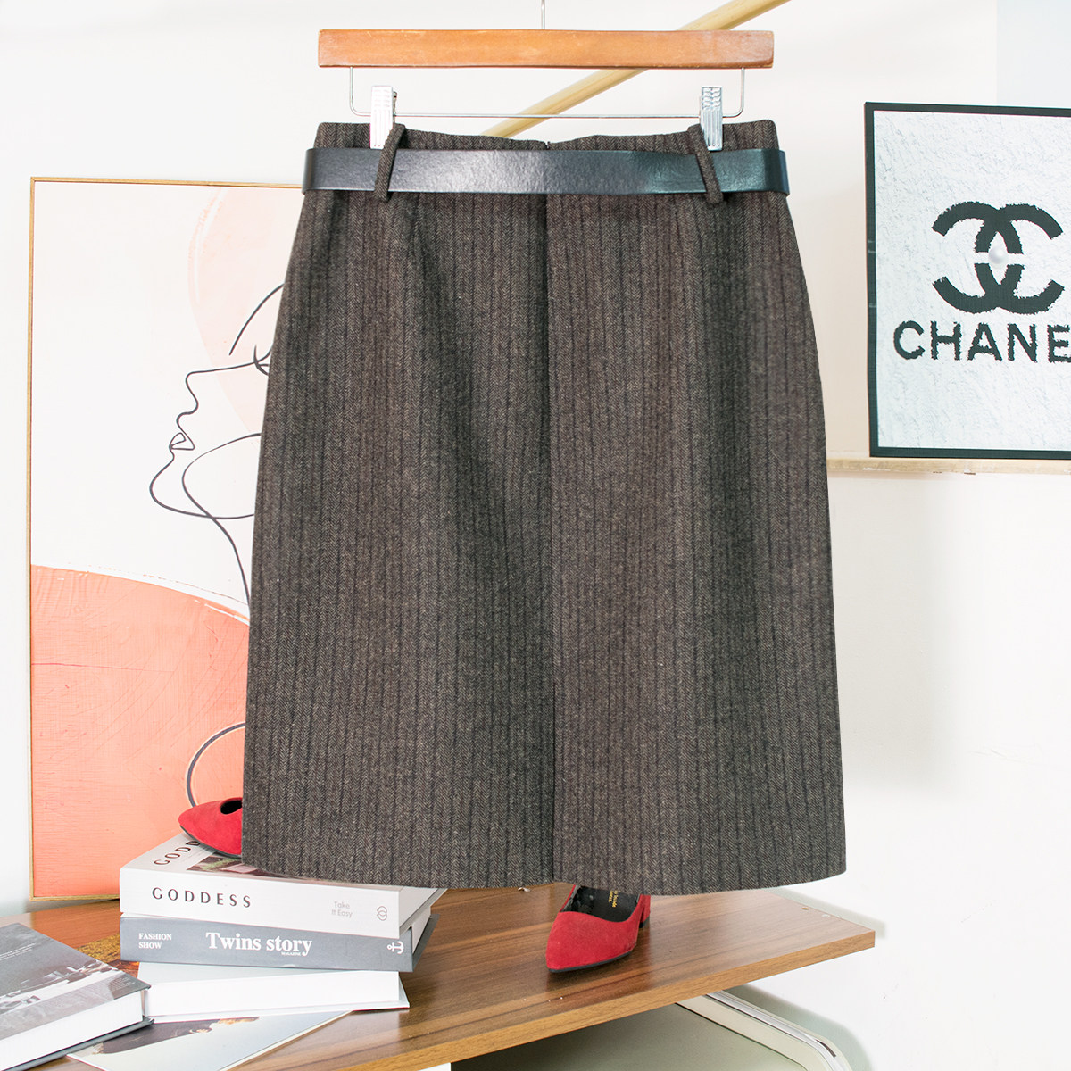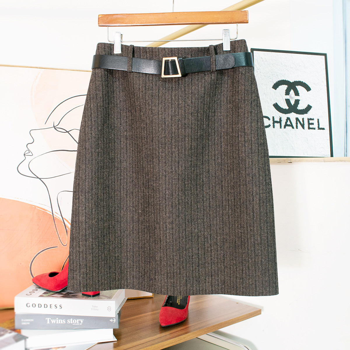 📚 秋冬条纹半身裙直筒裙老钱精纺羊毛呢人字纹时髦显瘦开衩半身中裙