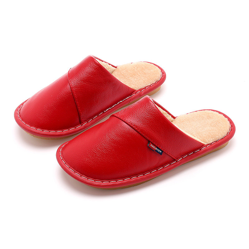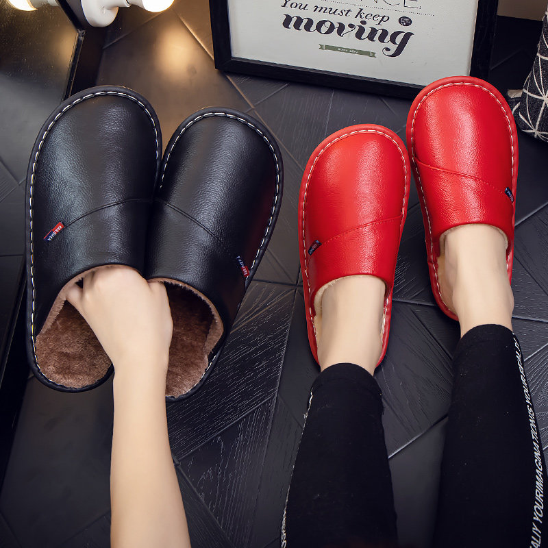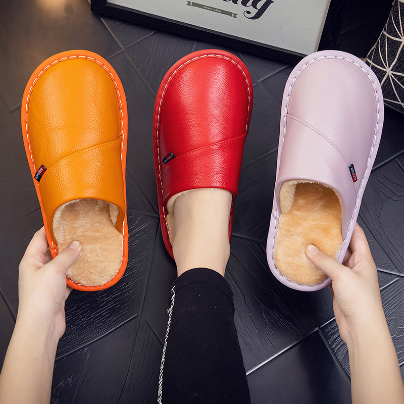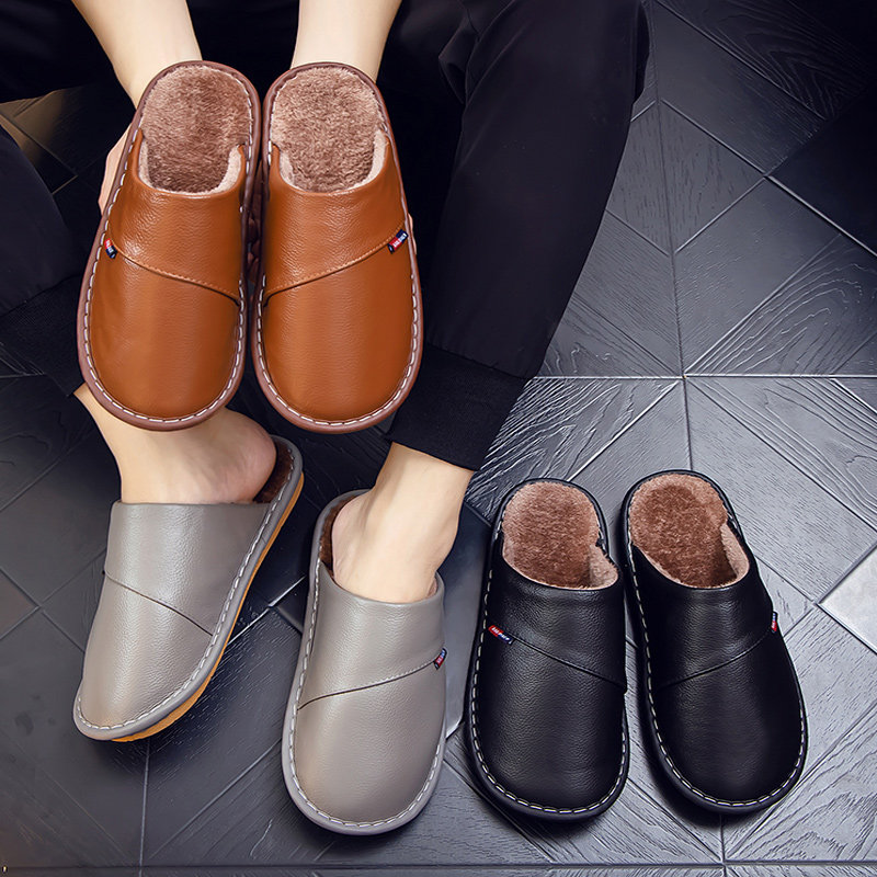 📚 海宁家用居家牛皮拖鞋冬季男女家居保暖厚底防滑真皮面棉拖鞋情侣