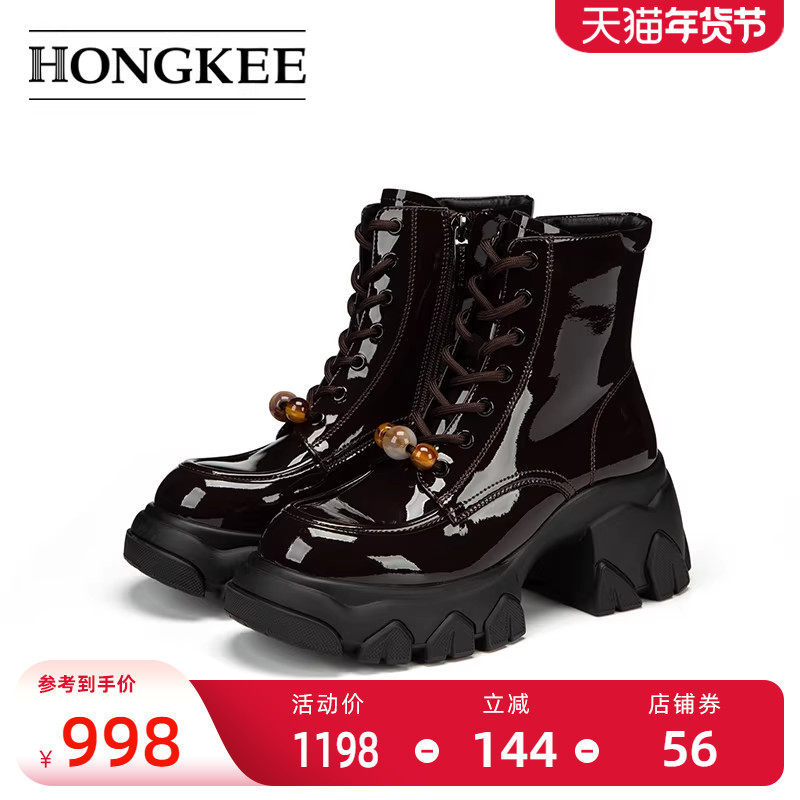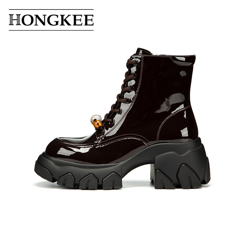 📚 Hongkee/红科短靴女款25新款时尚亮面侧拉链厚底粗跟女靴HA85M420