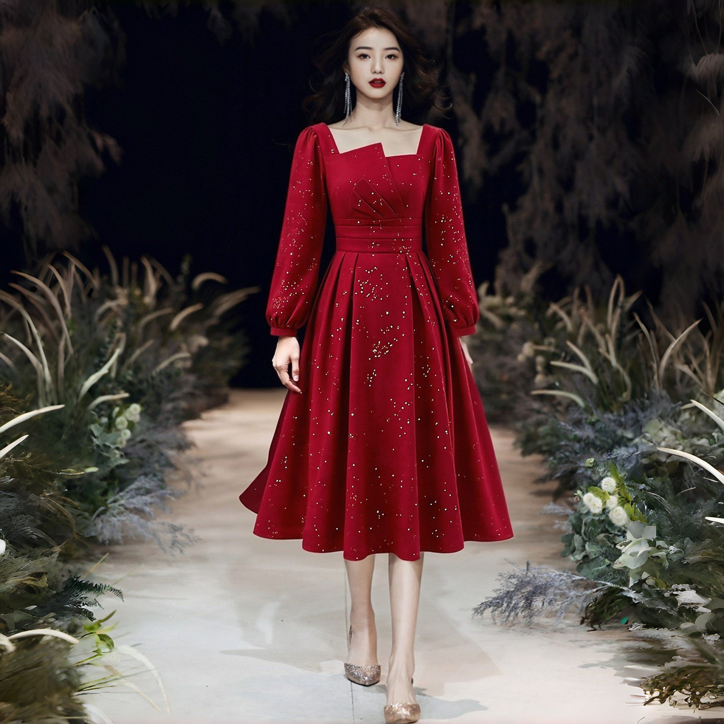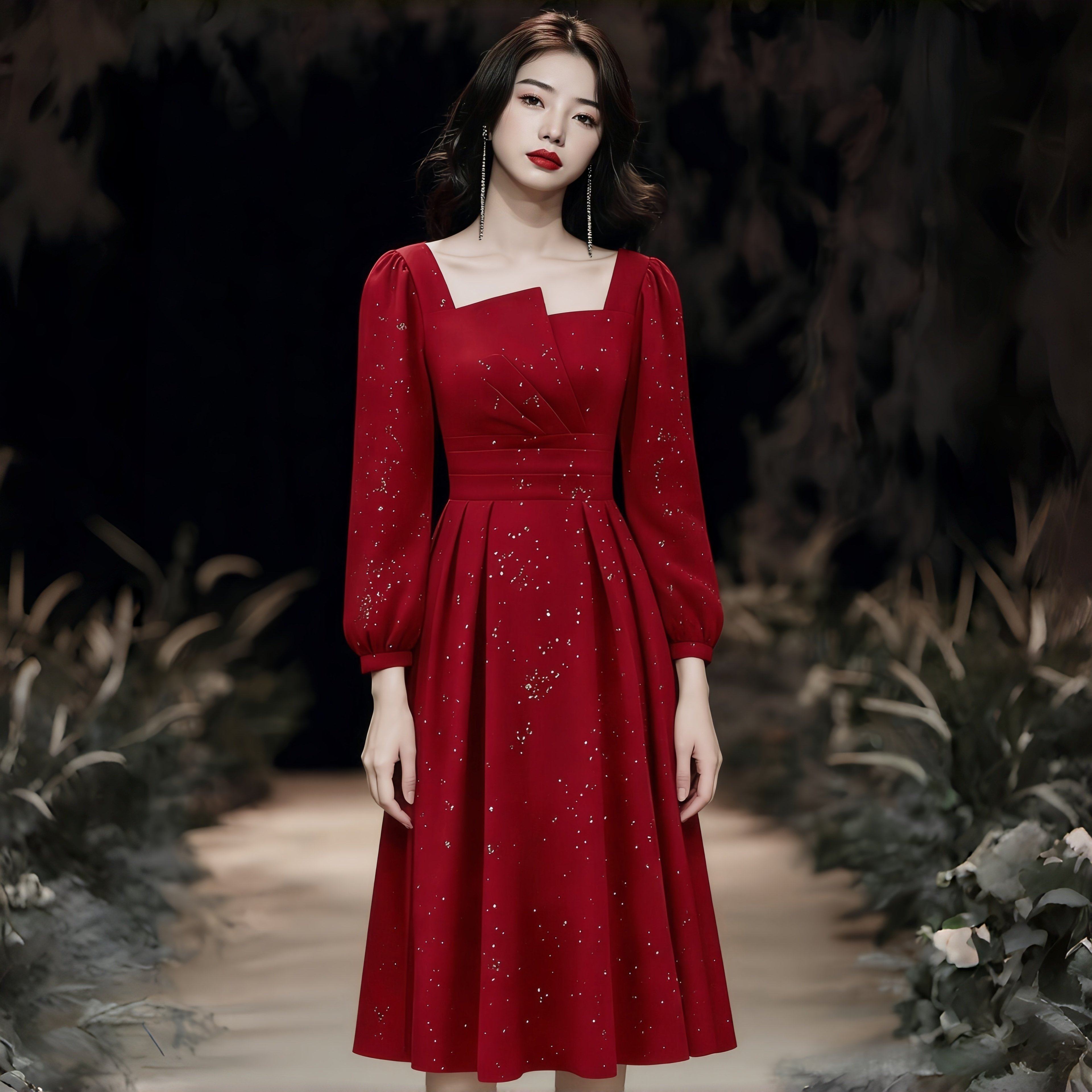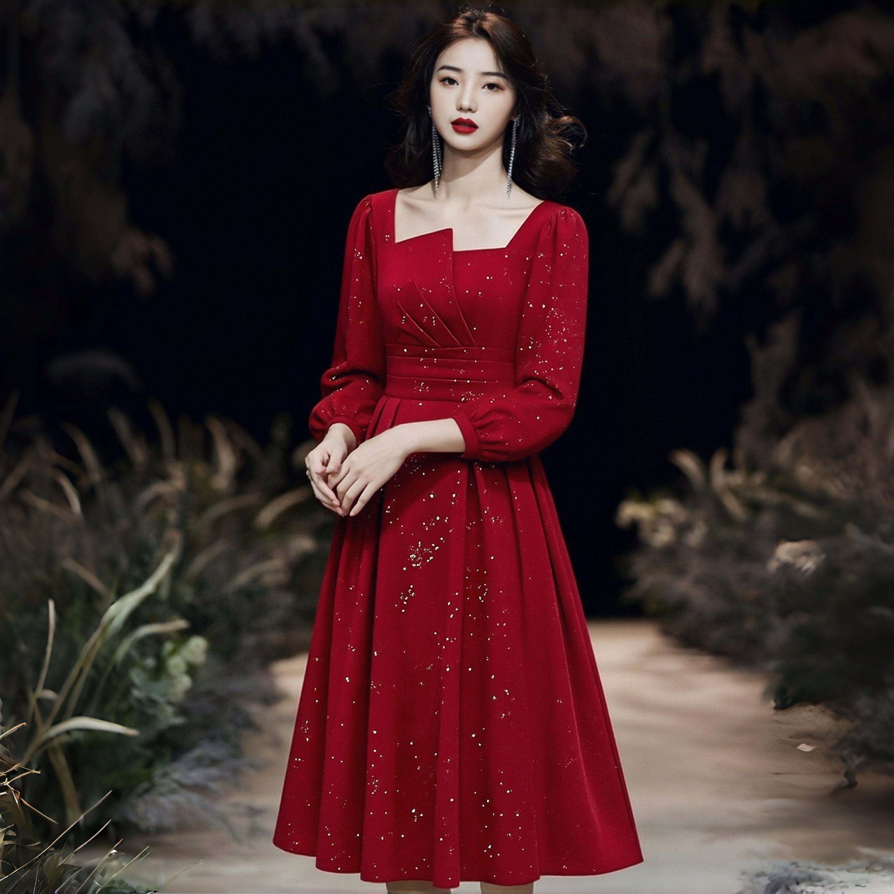 📚 法式红色敬酒服女修身中长款方领小个子新娘结婚订婚礼服平时可穿