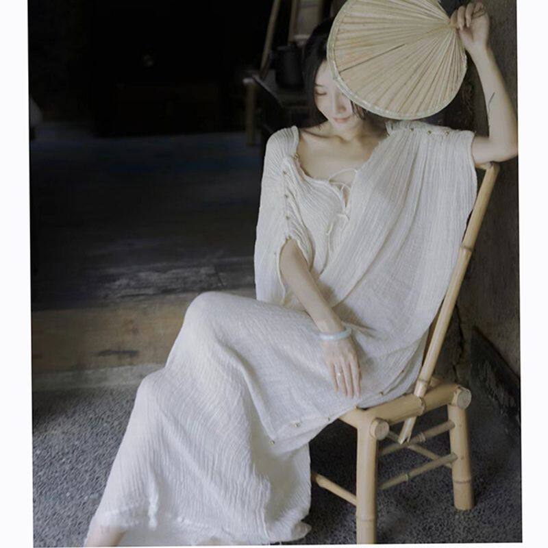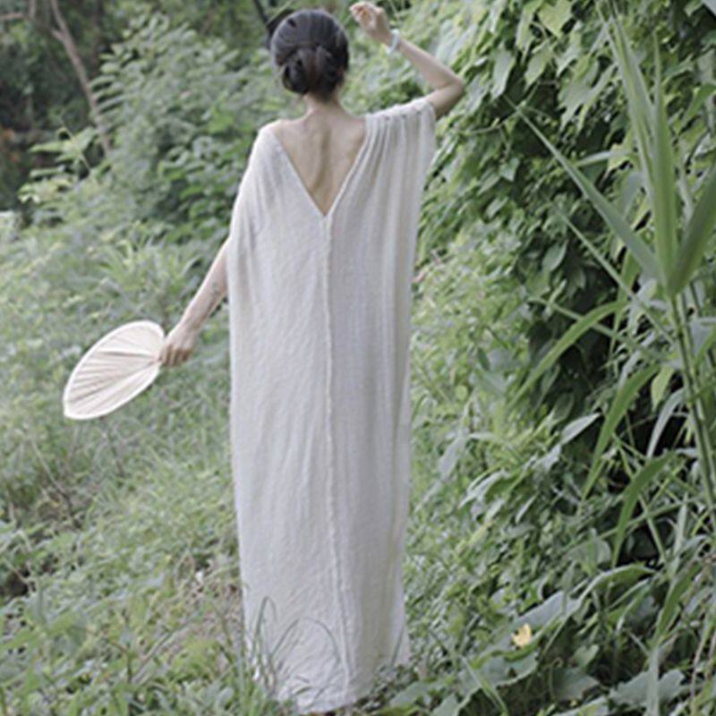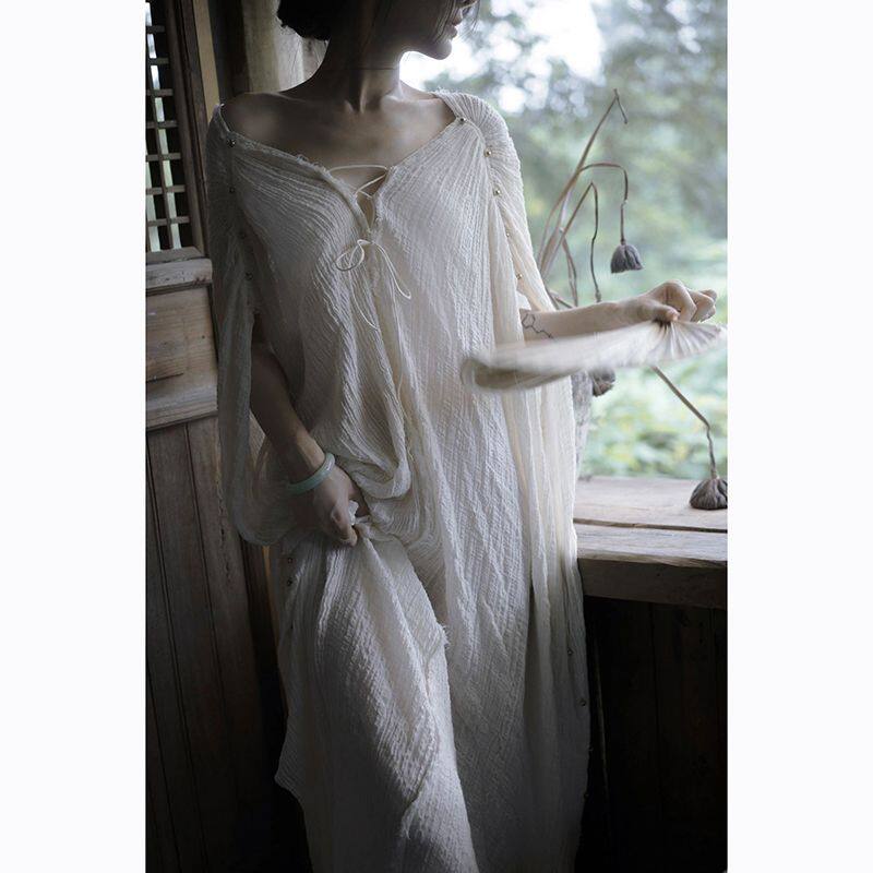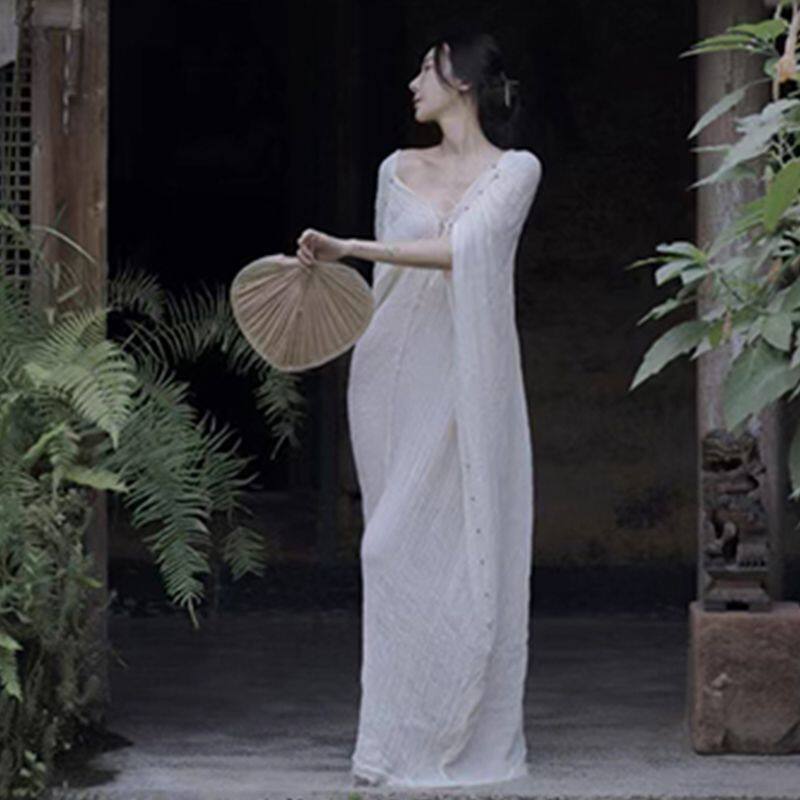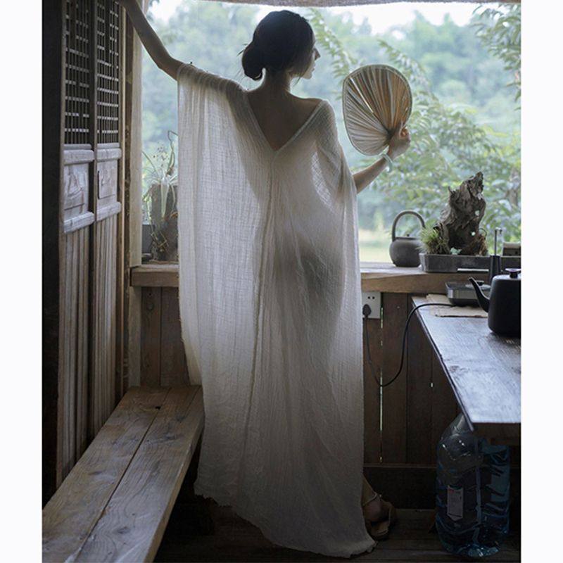 📚 优雅浪漫礼服裙新中式禅意V领露背宽松披风式连衣裙晨袍家居服秋