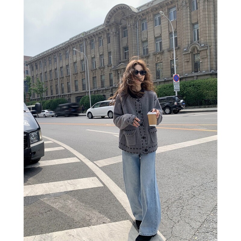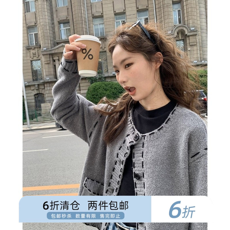📚 你好卡农 撞色虚线装饰感针织开衫女2024新款慵懒风宽松休闲毛衣