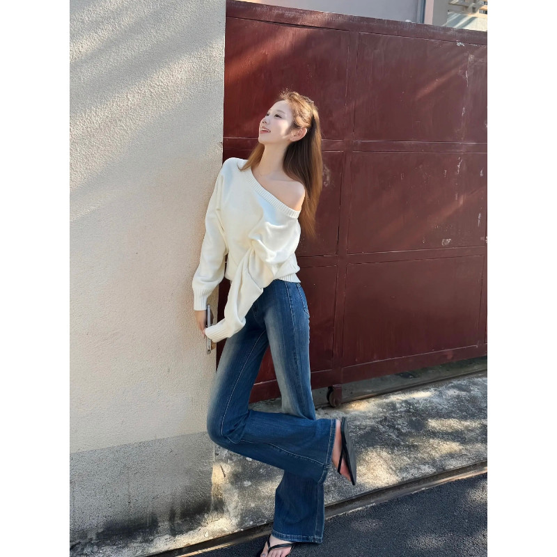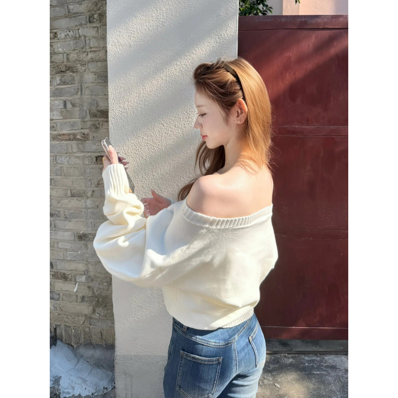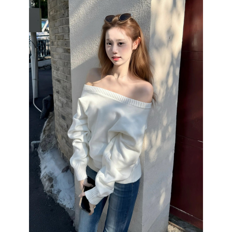 📚 白色一字肩蝙蝠袖毛衣女装秋季长袖斜肩针织衫松弛感chic韩系上衣