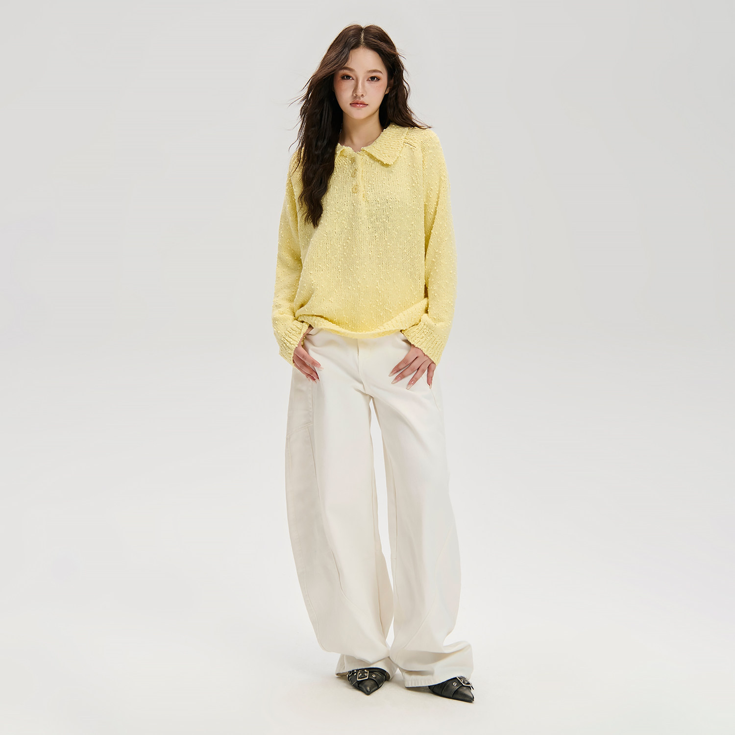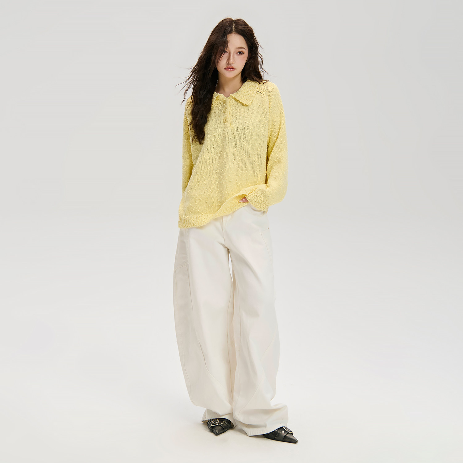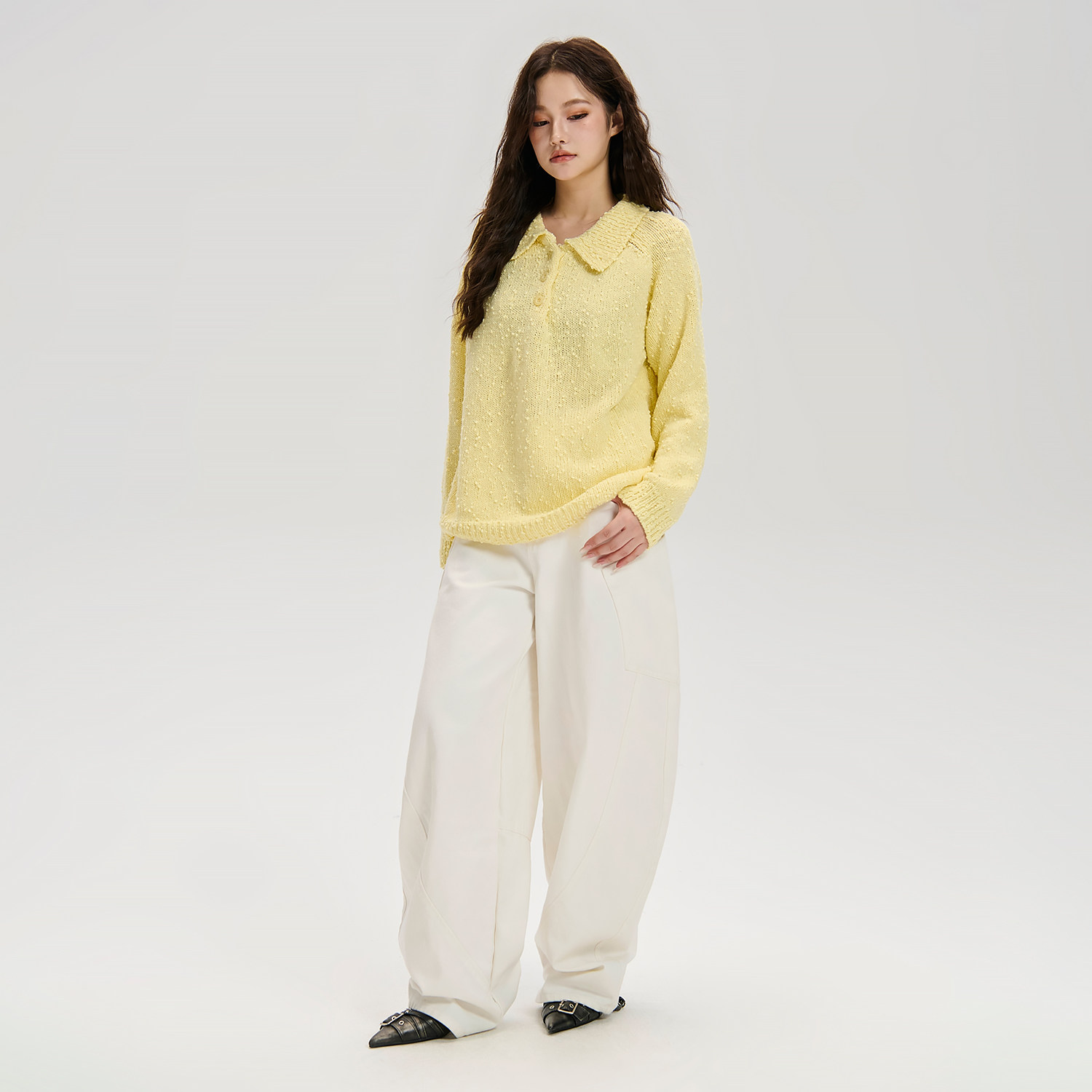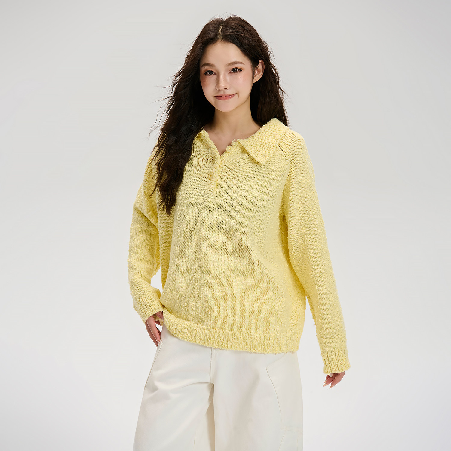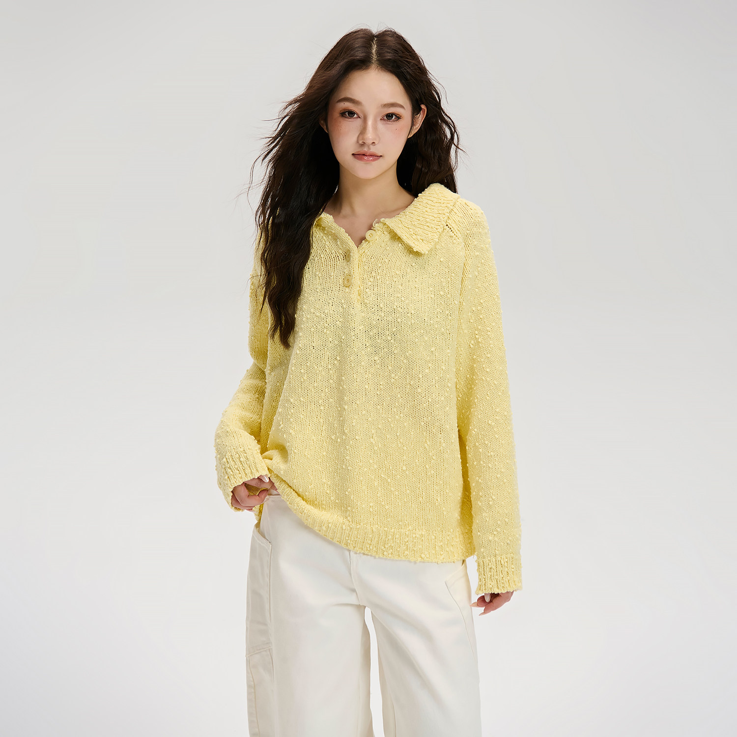 📚 LOSTCTRL 秋季高级感轻薄黄色翻领原创小毛球设计感宽松针织毛衣