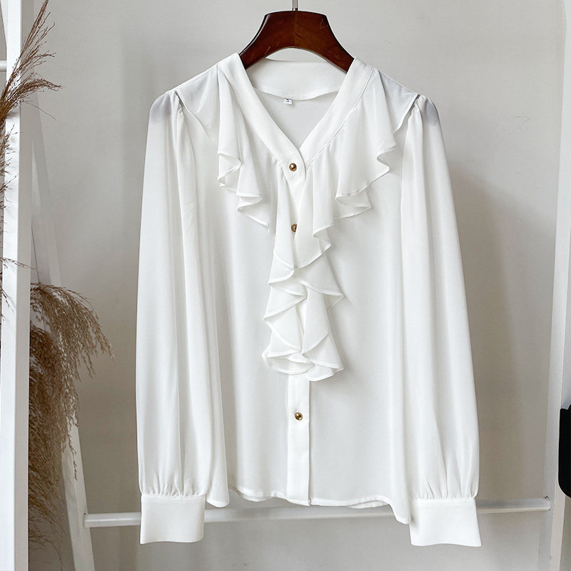📚 衬衫女2024春夏新款气质V领法式荷叶边上衣设计感洋气长袖雪纺衫