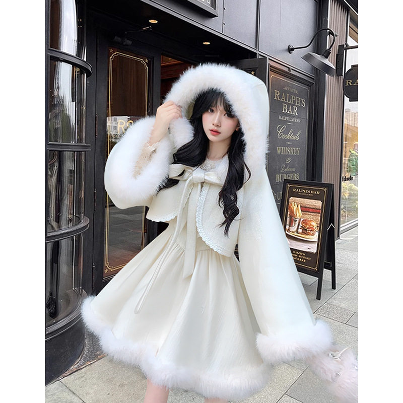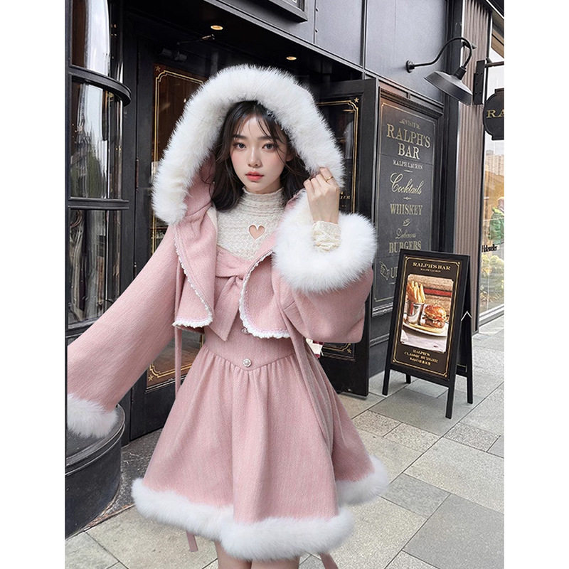 📚 瑞拉仙境 重工连帽斗篷+气质吊带裙毛呢套装裙2025冬季甜美两件套