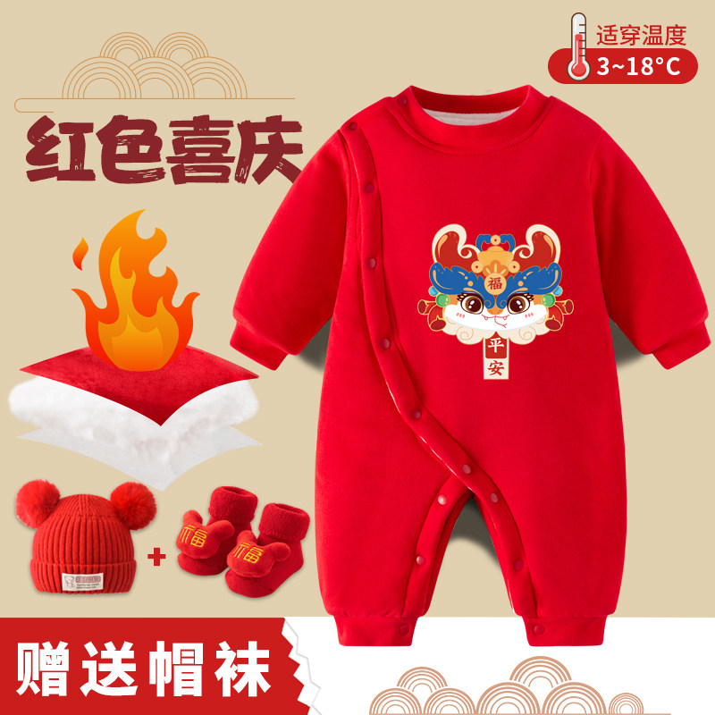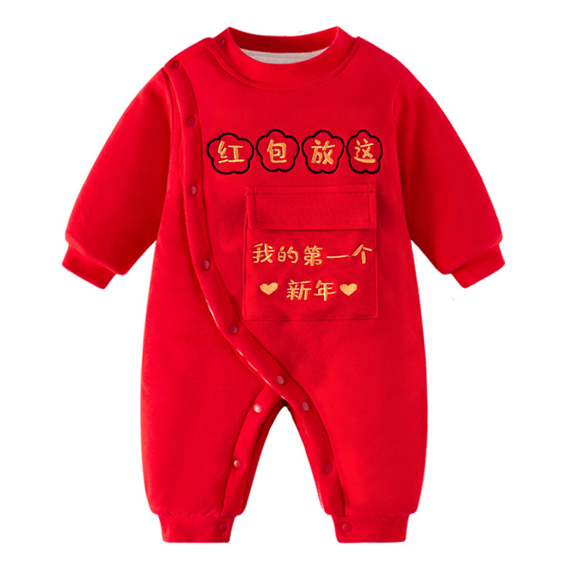 📚 婴儿拜冬年服蛇马年喜庆宝宝新年装加绒加厚收红包拿来连体衣冬装