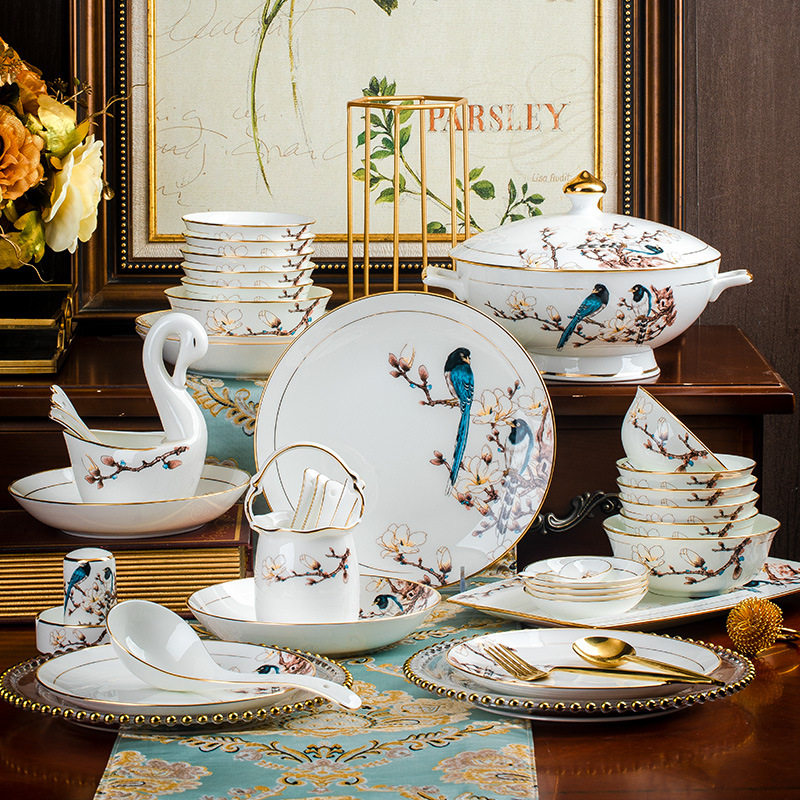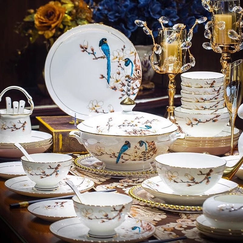 📚 景德镇骨瓷轻奢新中式碗盘碗碟餐具套装家用金边陶瓷碗筷组合喜鹊