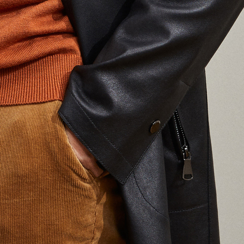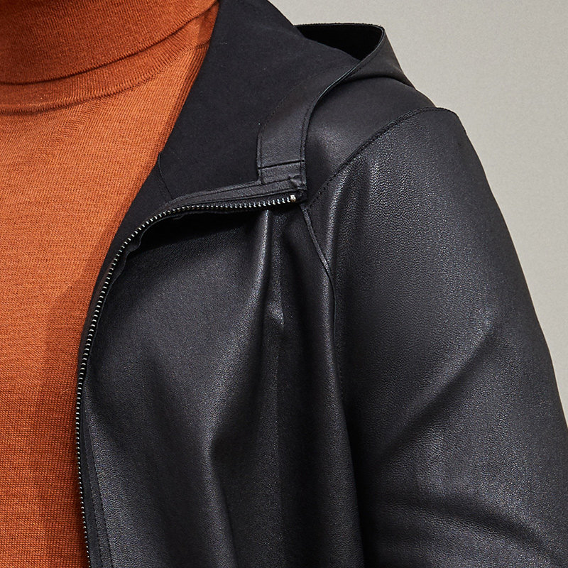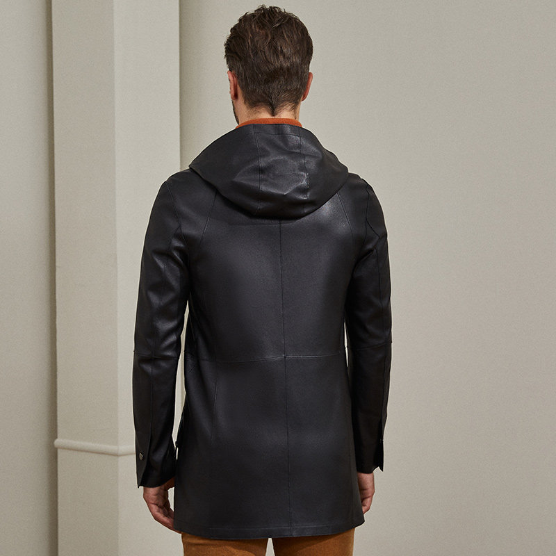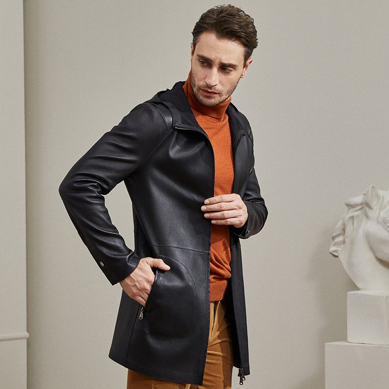 📚 雪豹真皮皮衣男头层绵羊皮商务休闲体制内连帽中长弹力皮风衣外套