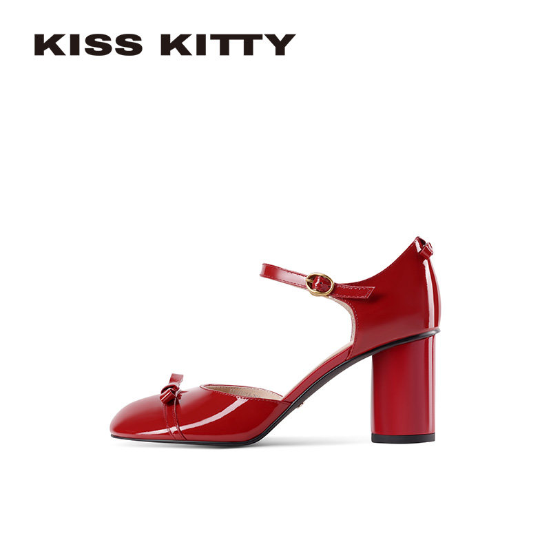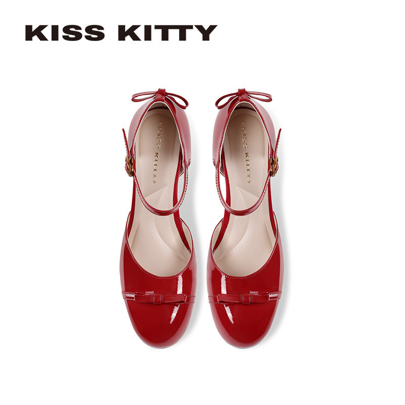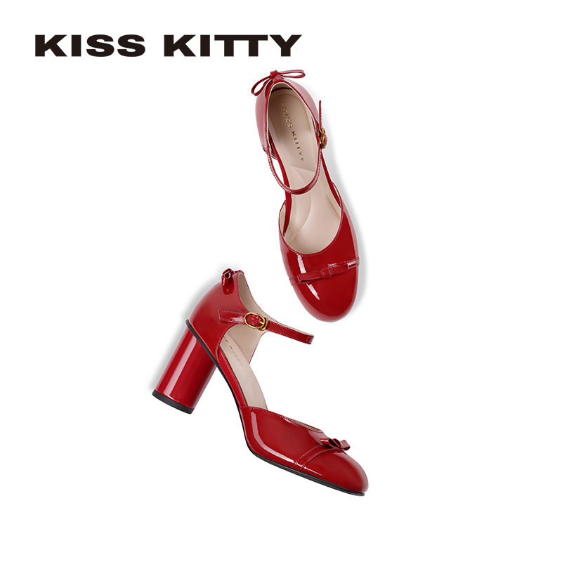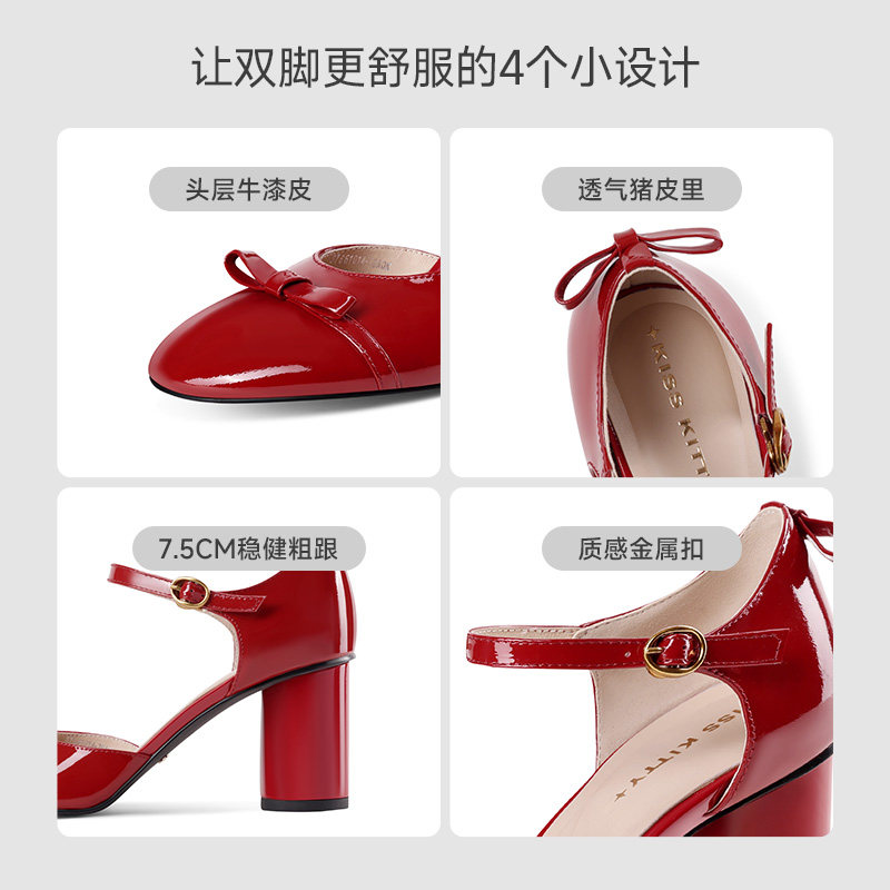 📚 KISSKITTY一字扣带凉鞋女2026春新款红色包头粗跟圆头中空高跟鞋