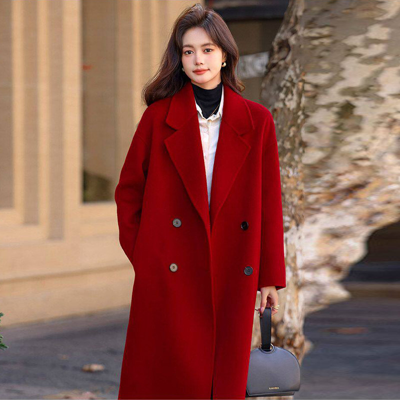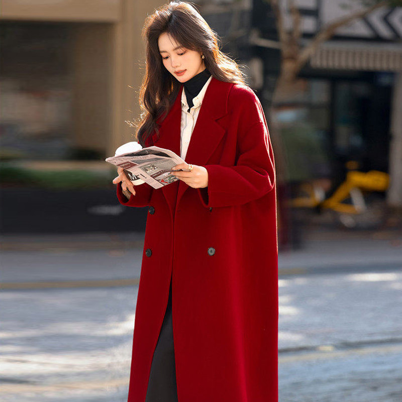 📚 酒红色毛呢外套女韩系秋冬装大码胖mm200斤新年结婚加厚呢子大衣
