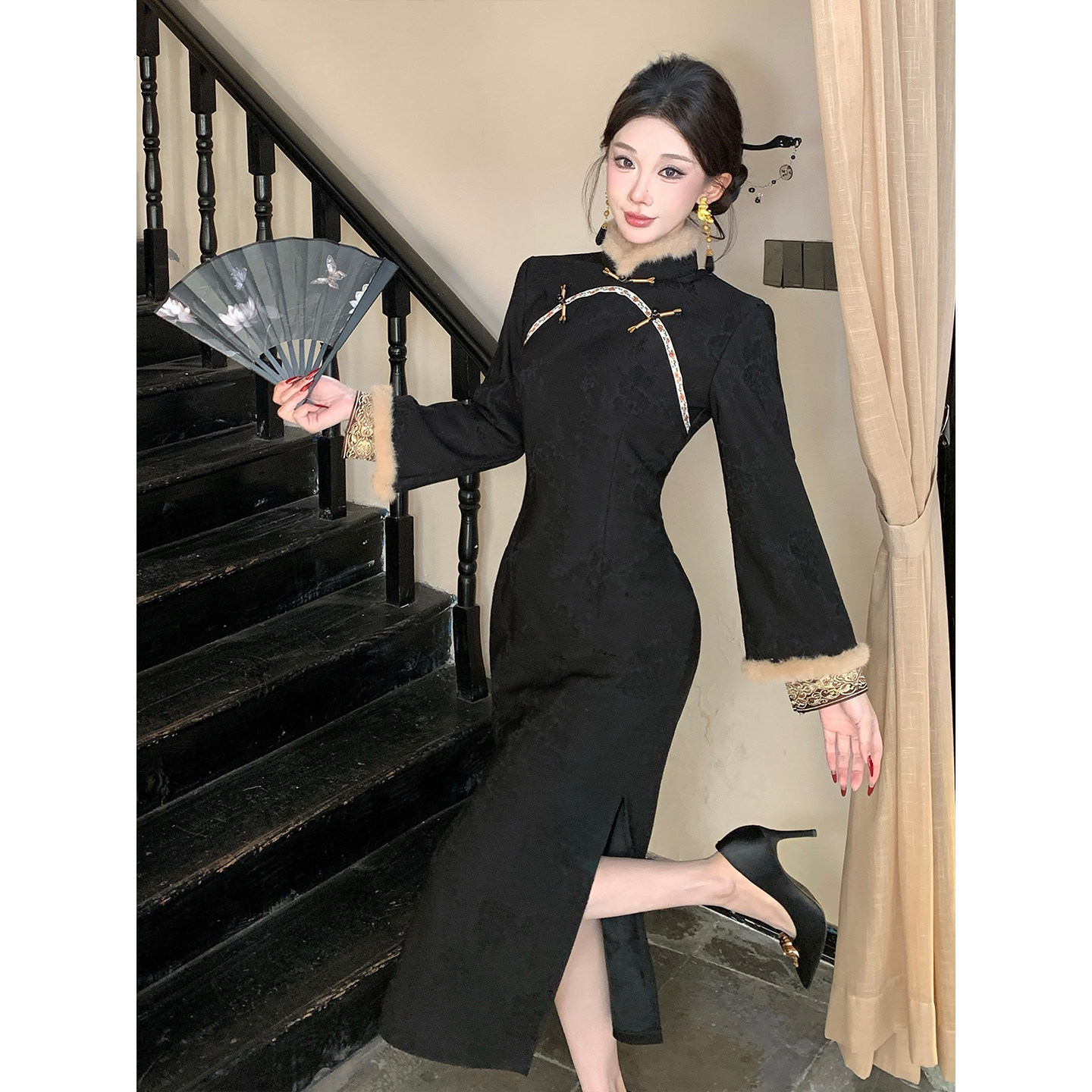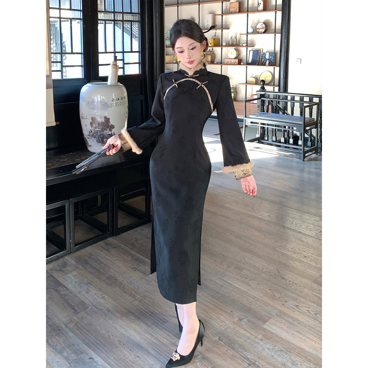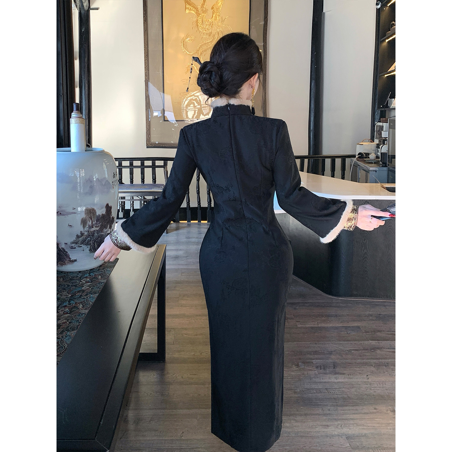 📚 黑色旗袍女新中式冬装加绒加厚长袖气质民国风可以上班穿的冬季款