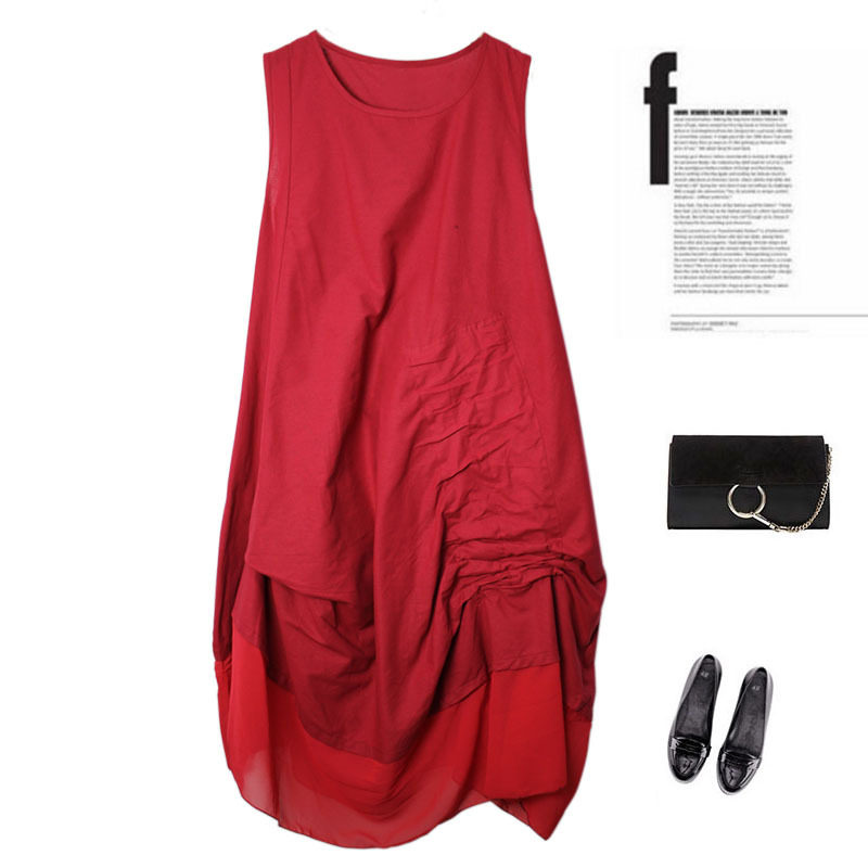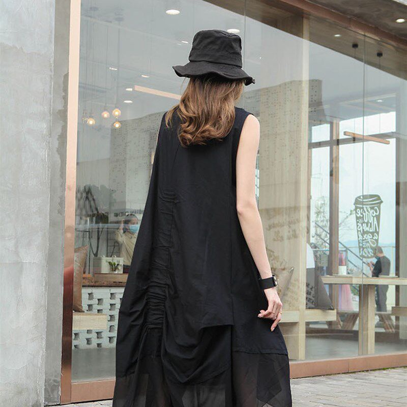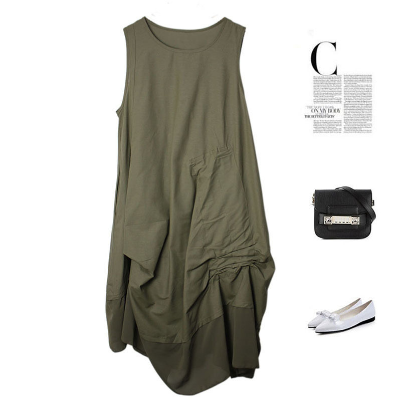 📚 中长款背心裙女宽松圆领无袖个性折皱连衣裙百搭民族风打底裙背心