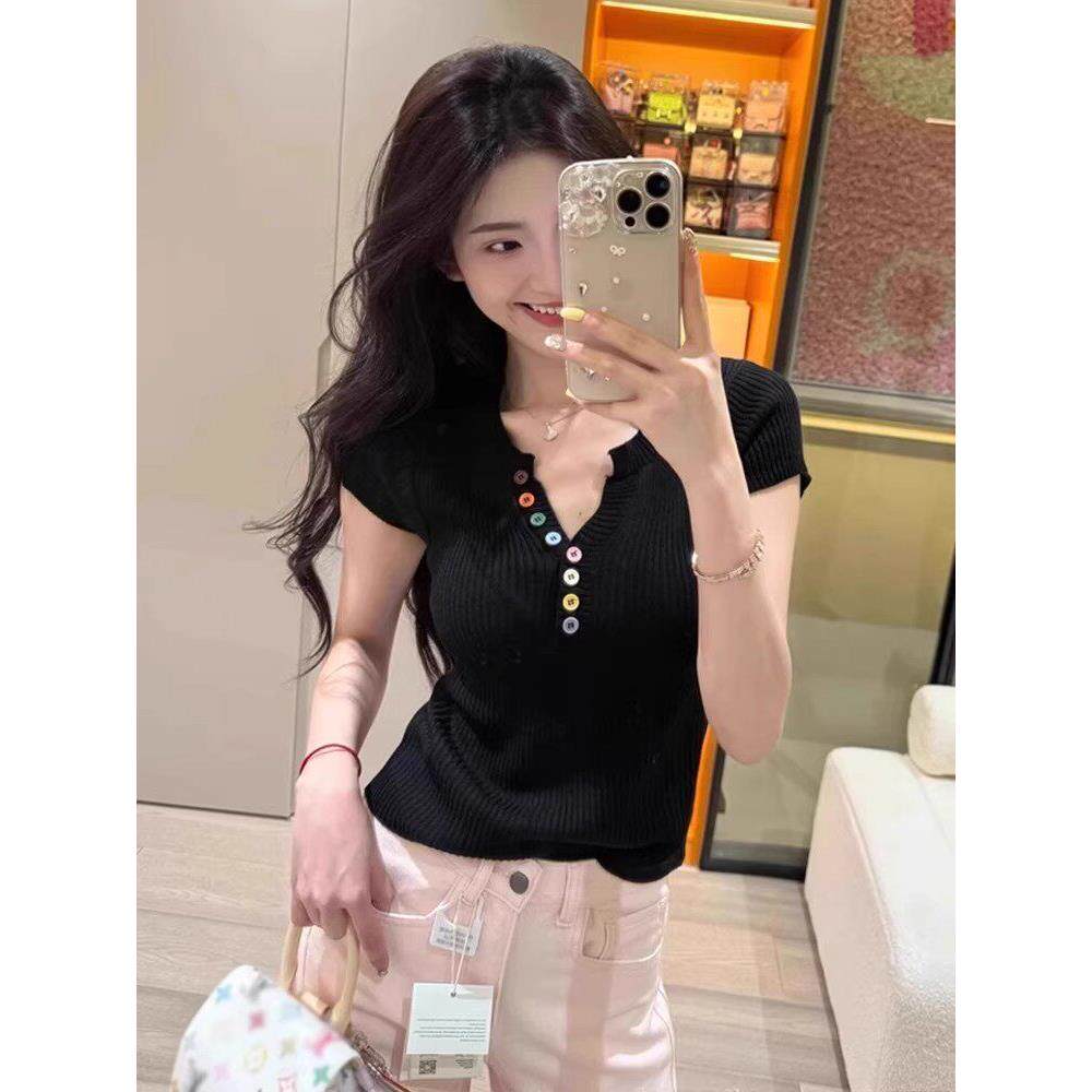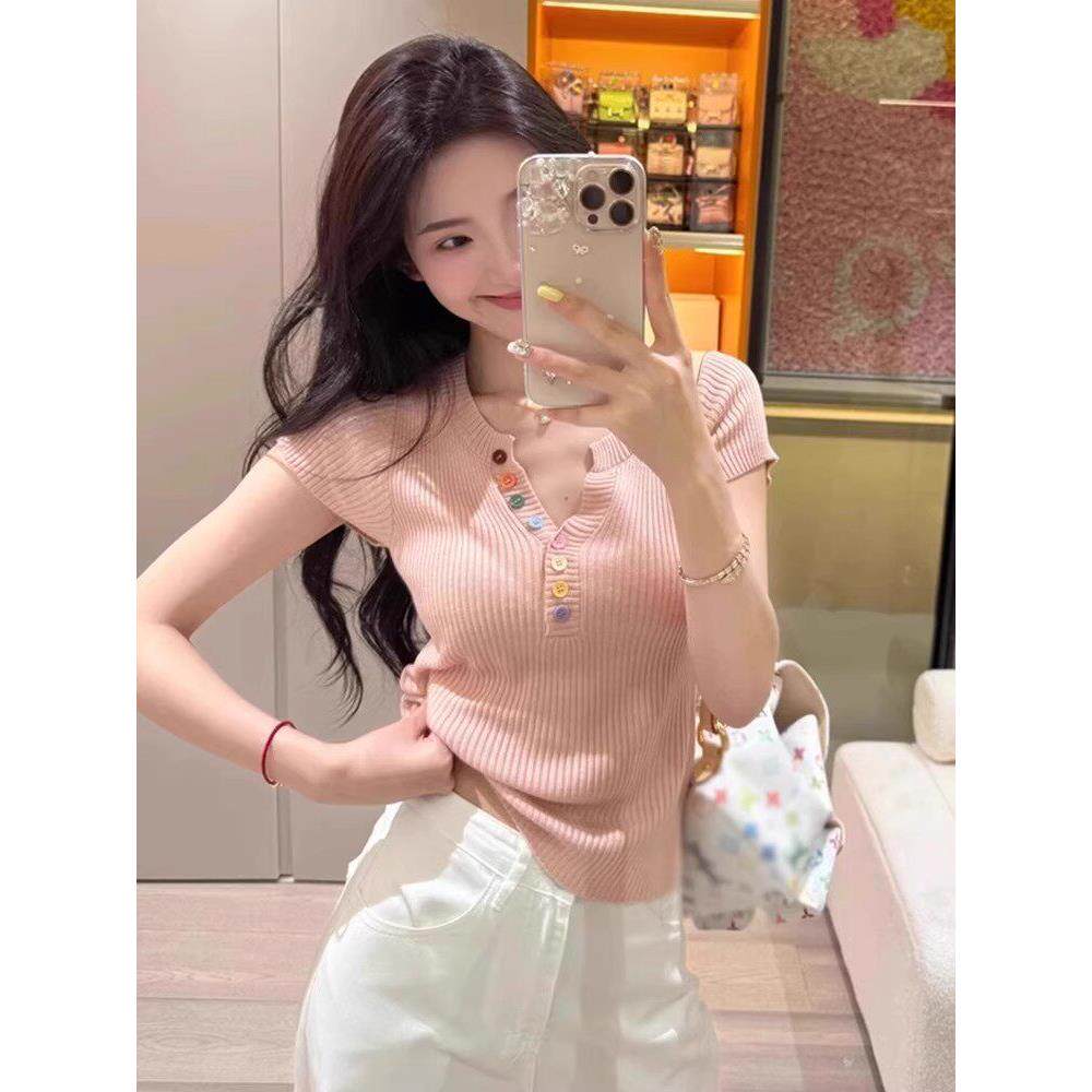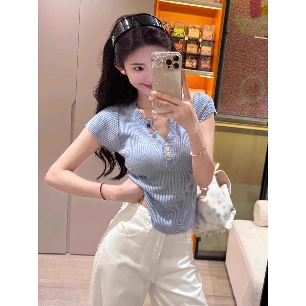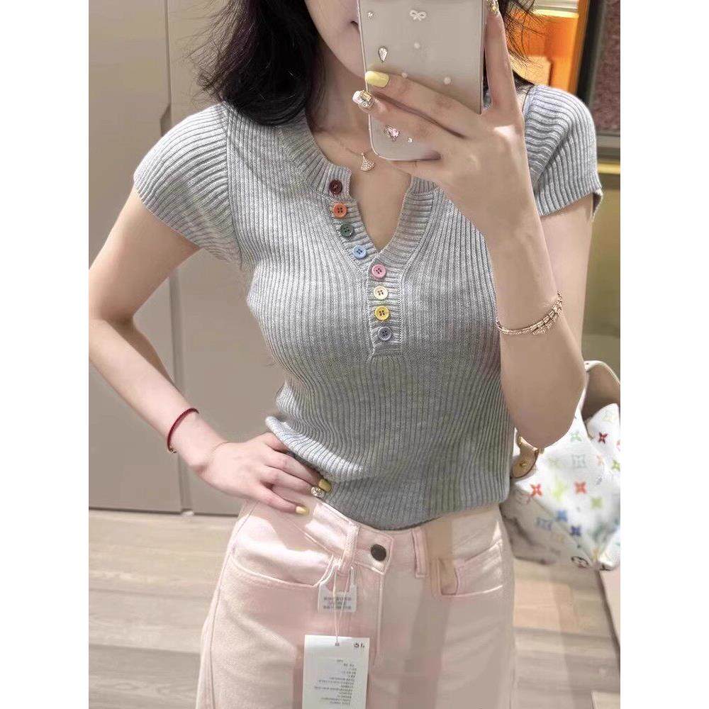 📚 法国Rixo Rane私下隐藏心爱的?彩色纽扣右肩短袖t恤女士修身短v领
