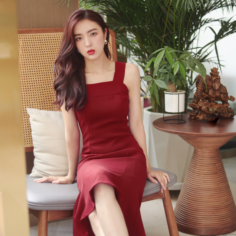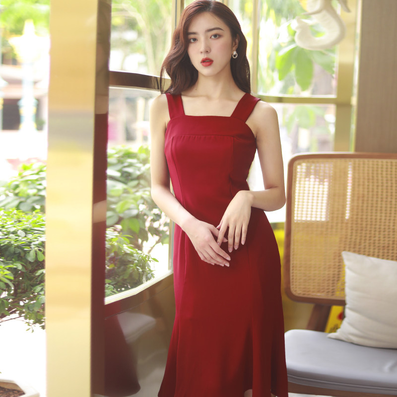 📚 复古连衣裙包臀鱼尾裙宽肩带吊带裙晚礼服红色裙子女夏季2021新款
