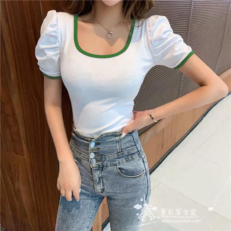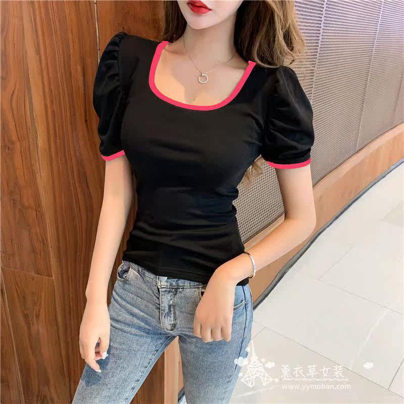 📚 显瘦性格泡泡袖t恤女夏新款辣妹纯欲风短袖修身撞色百搭上衣小衫