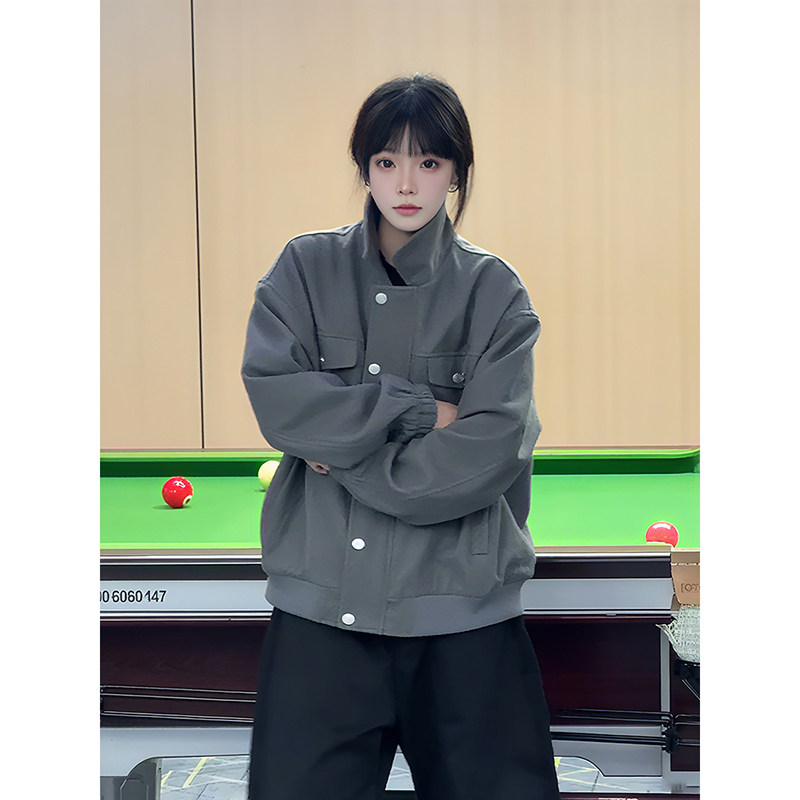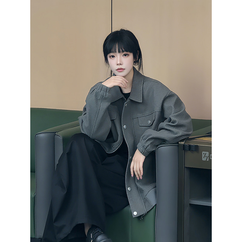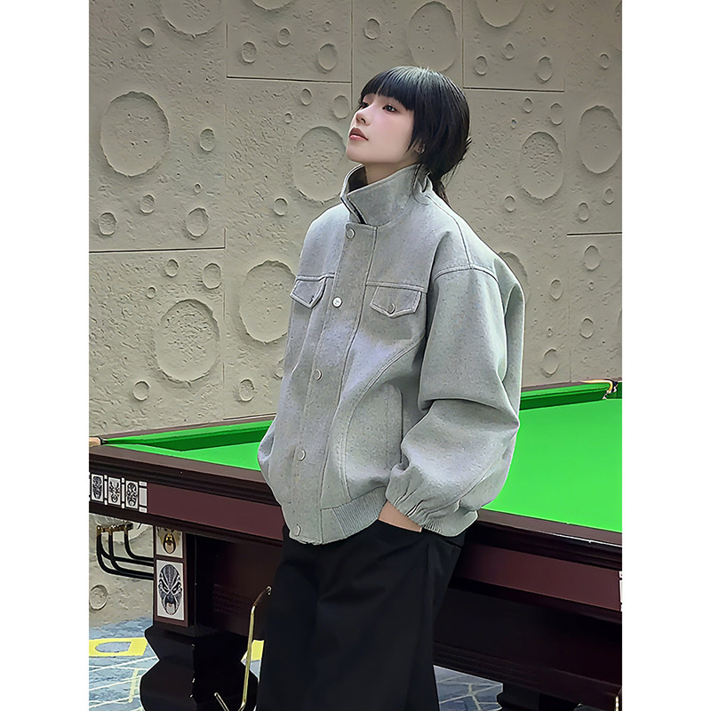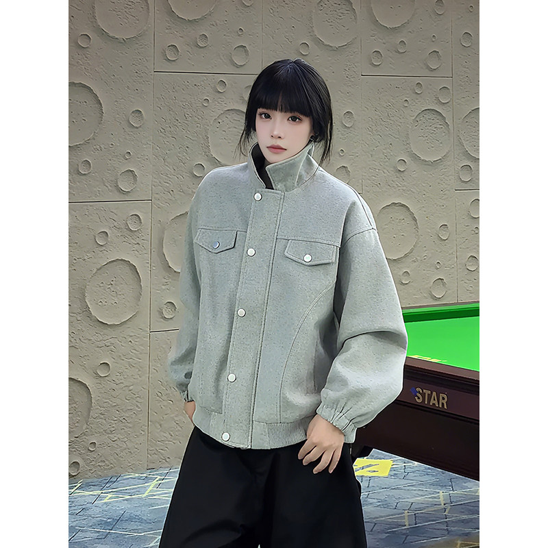 📚 浅灰色短款毛呢外套男款秋冬季美式加厚工装夹克高级感翻领棒球服