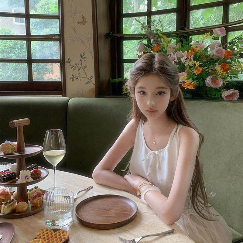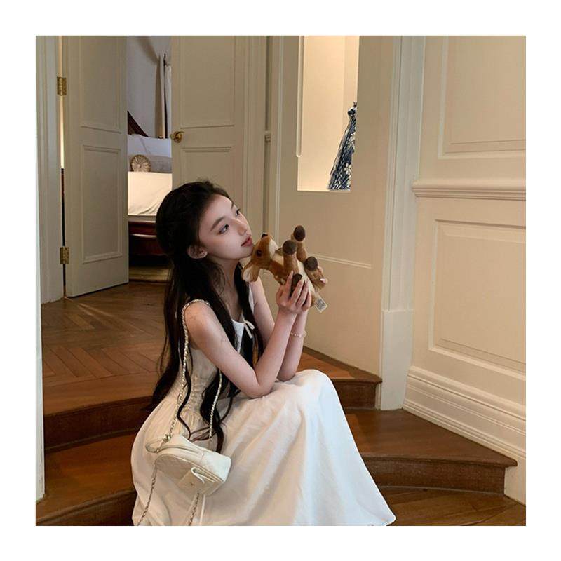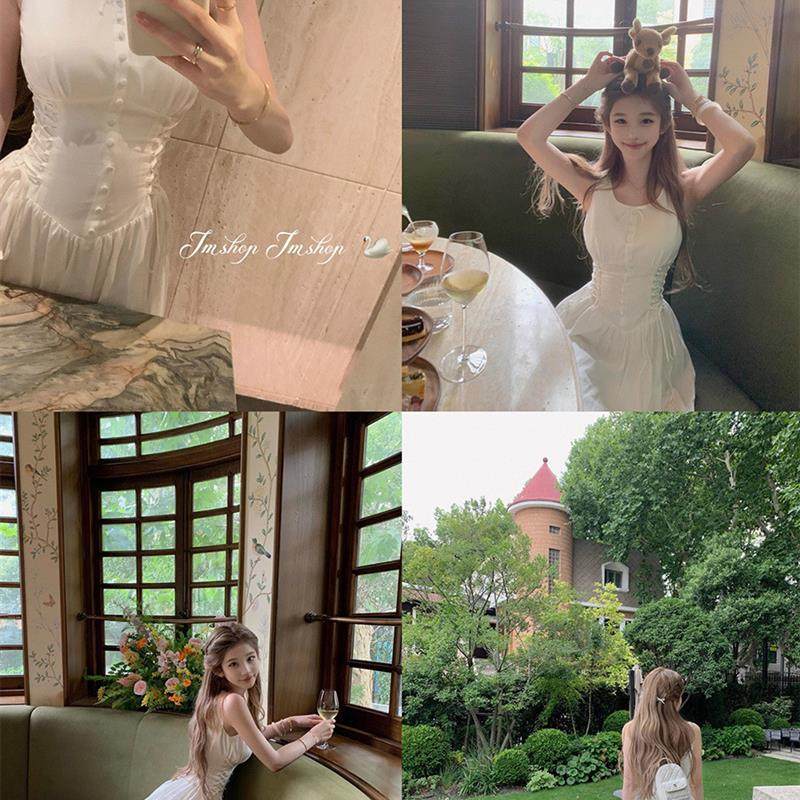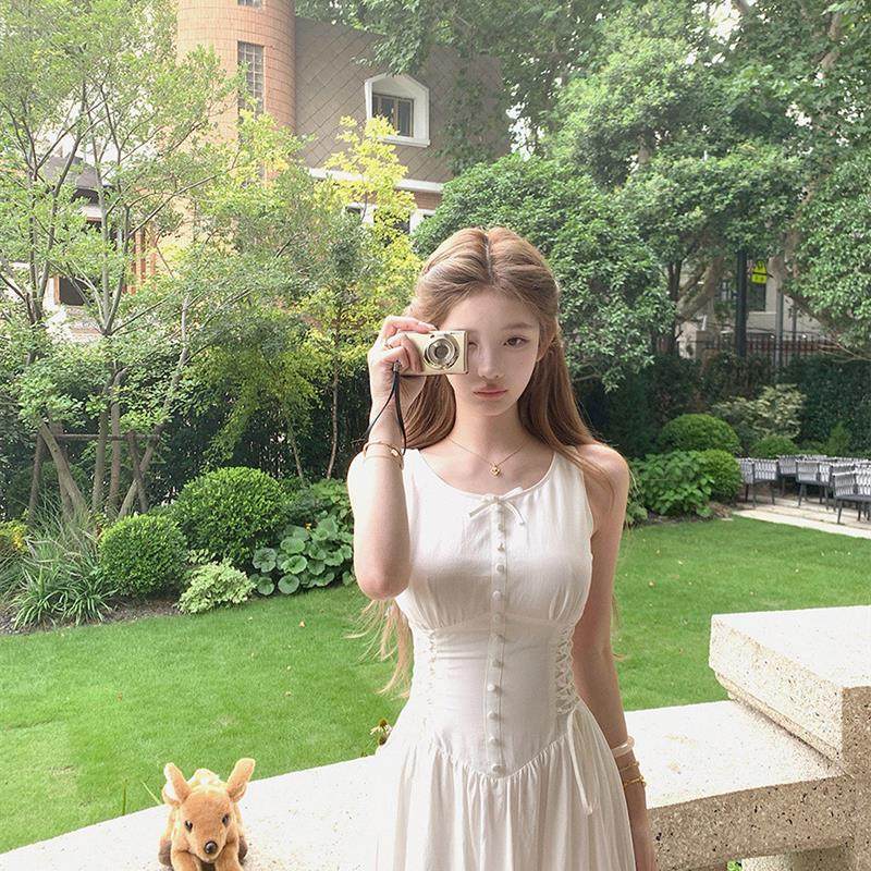 📚 JMSHOP 白色桔梗 少女感绑带收腰连衣裙女夏大方得体无袖长款裙子