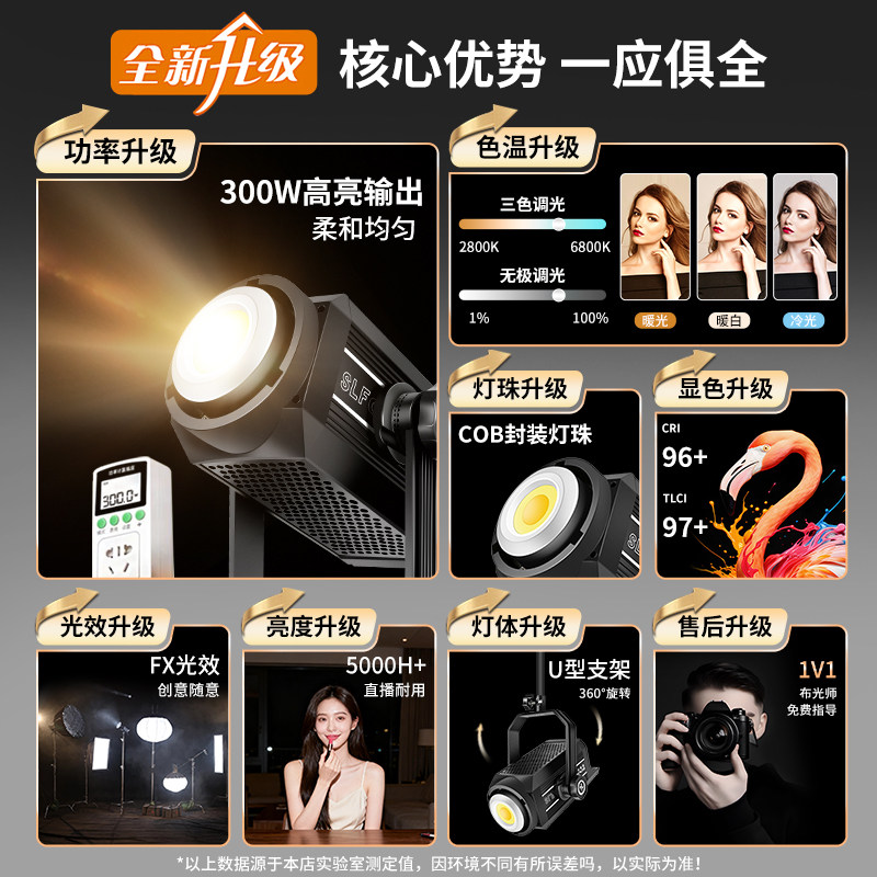 📚 300W大功率专业直播补光灯COB摄影灯室内拍照打光灯直播间主播专用拍摄地灯聚光影视深口抛物线网格蜂巢格栅