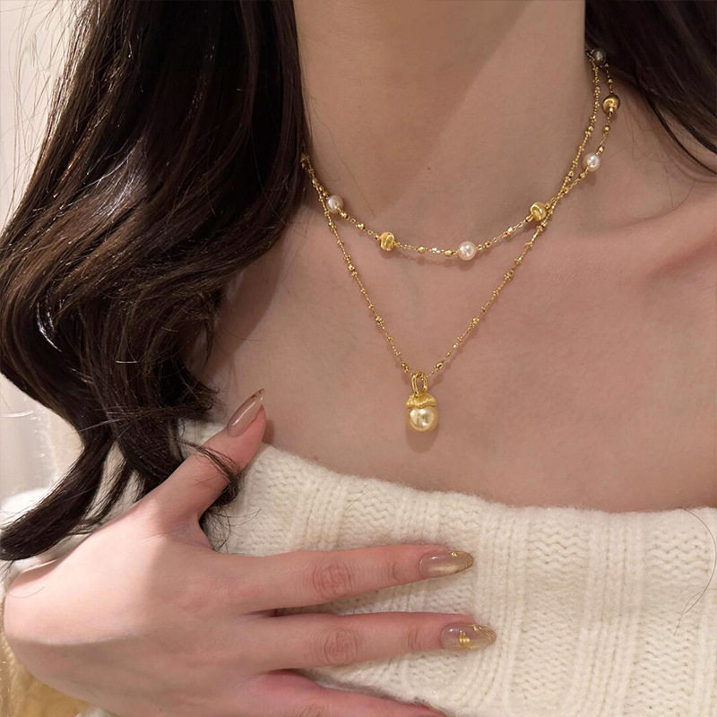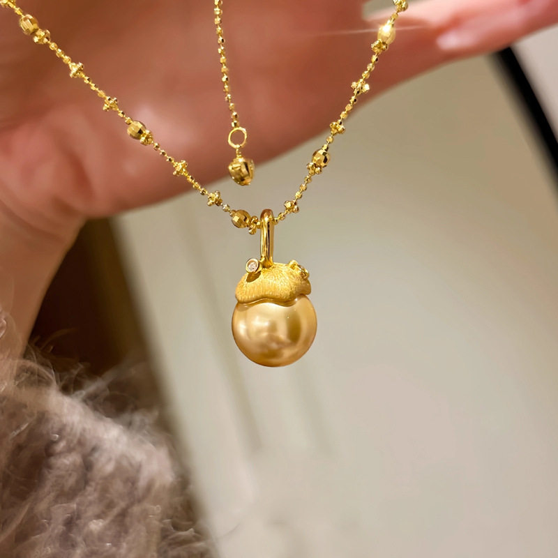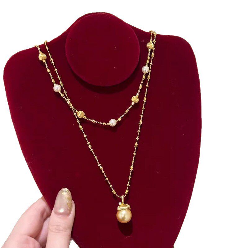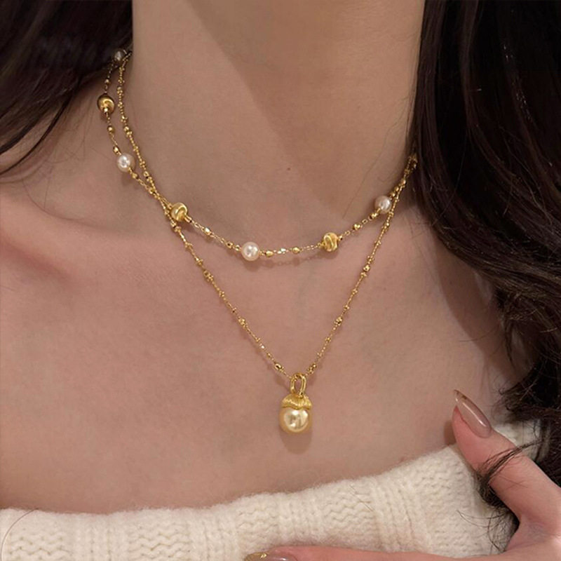 📚 日韩小松果猫眼珍珠项链轻奢小众黄金色锁骨链高级感叠戴吊坠颈链