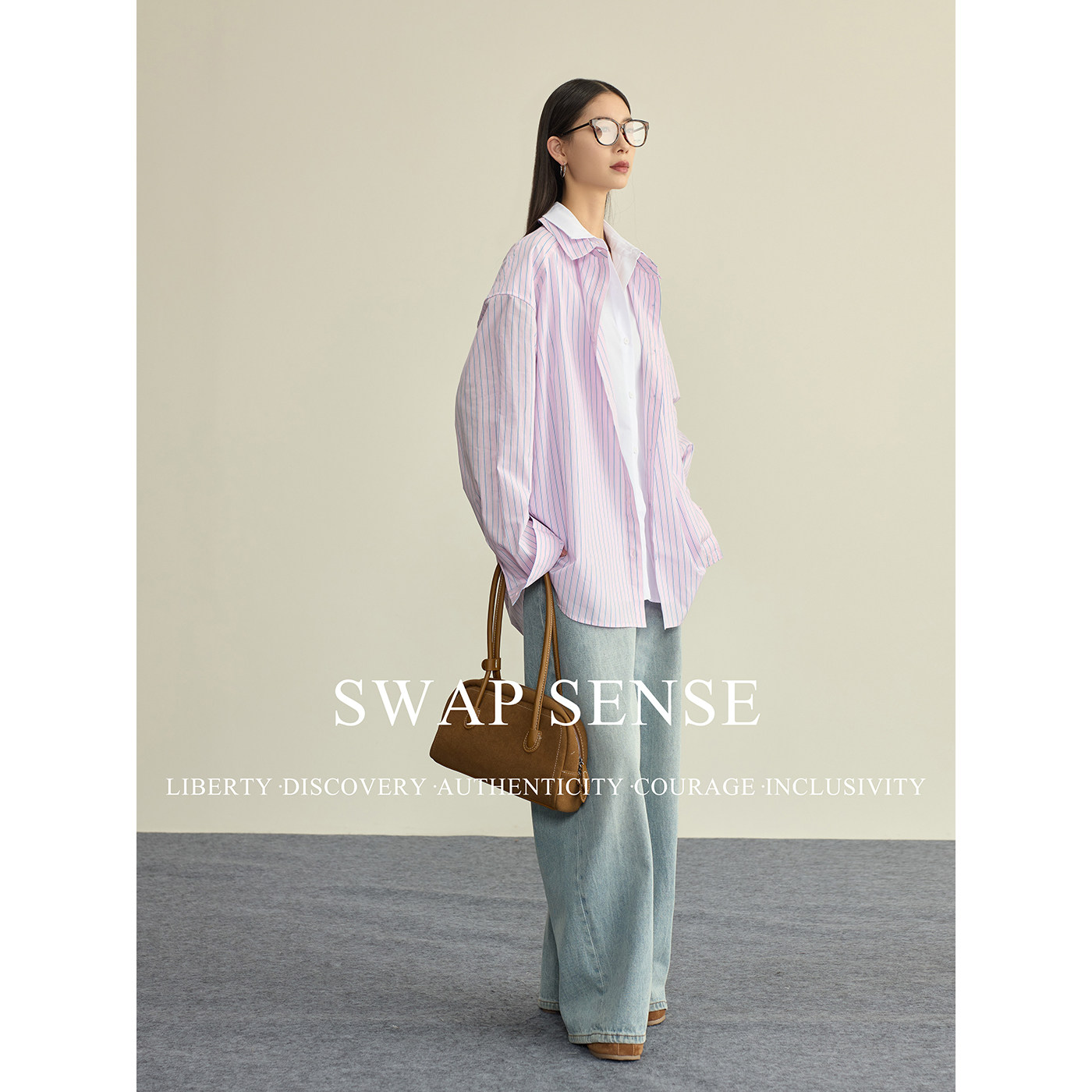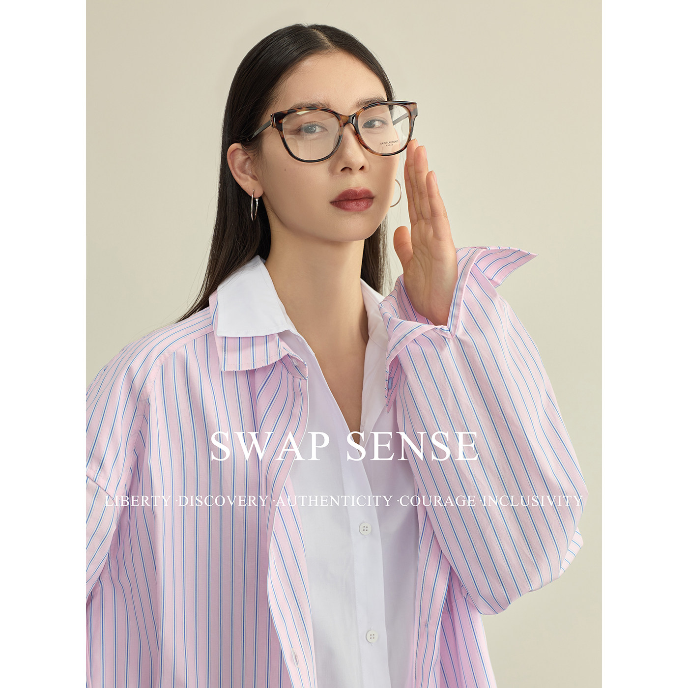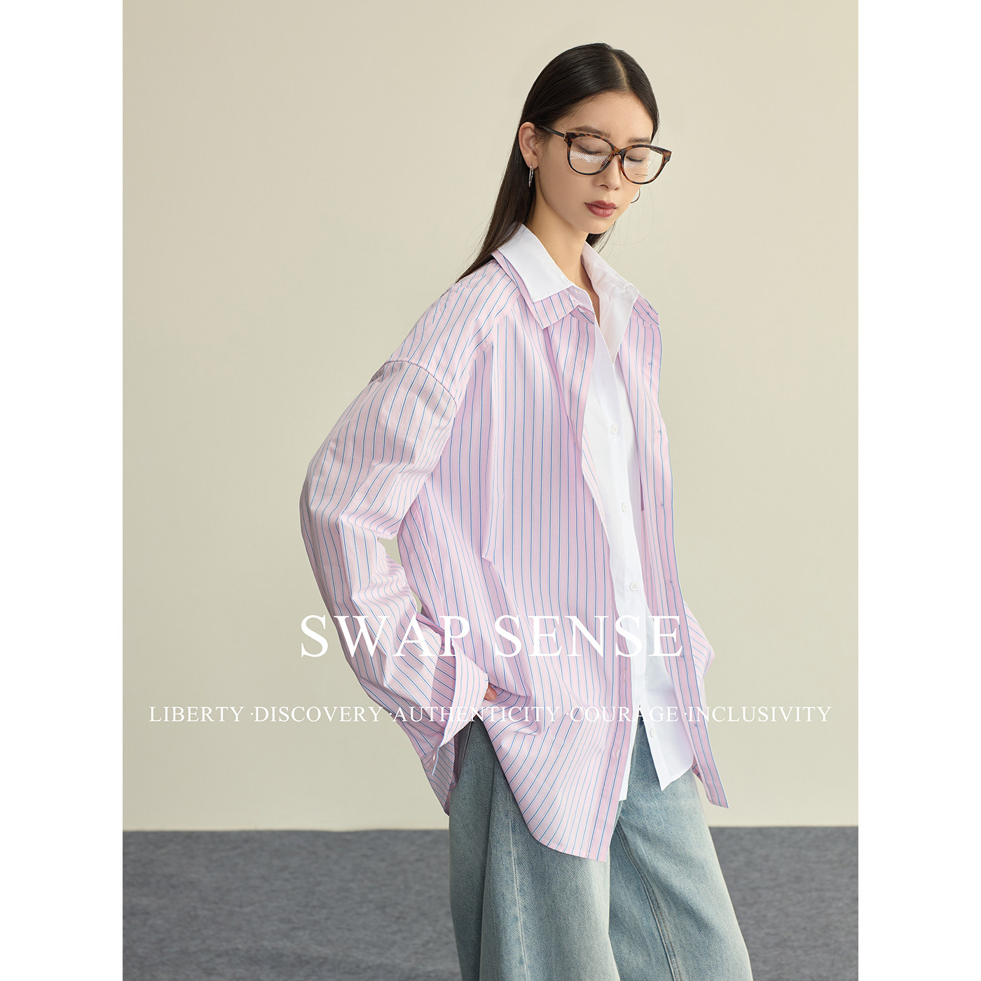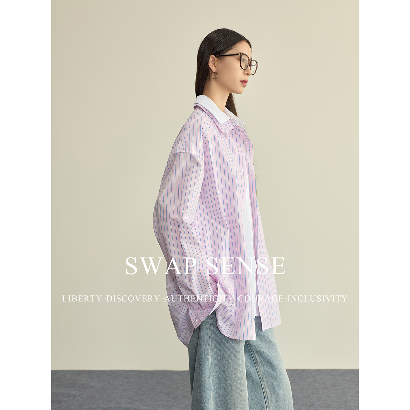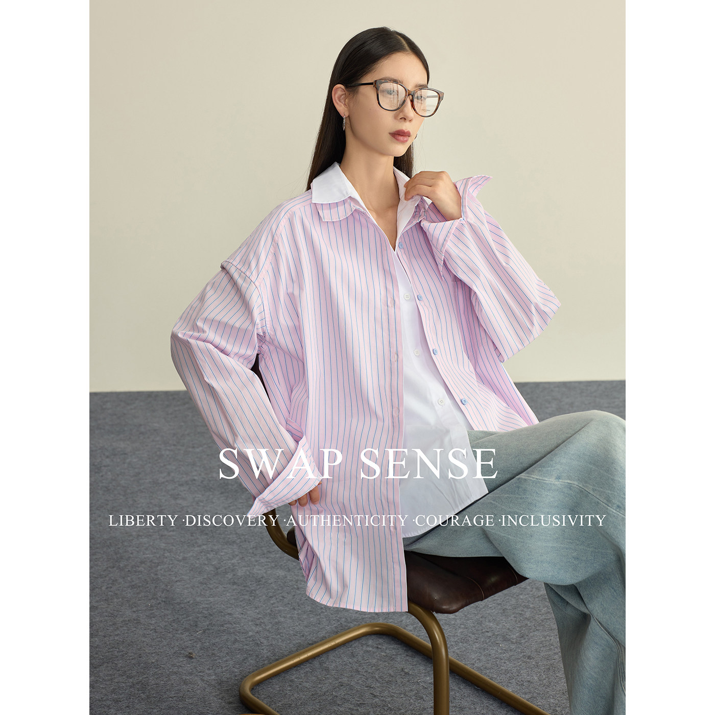📚 SWAP SENSE云端蓝调·复古休闲粉蓝撞色条纹假两件拼接长袖衬衫春