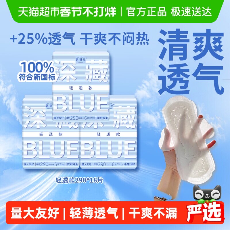 📚 她研社卫生巾姨妈巾深藏BLUE轻透款日用夜用超薄透气290*3包