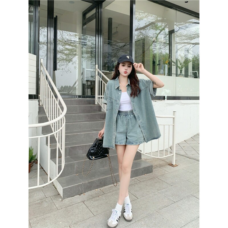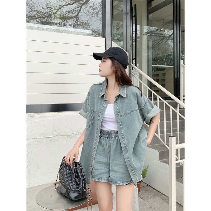 📚 大码2026夏季牛仔女装胖mm复古短袖外套上衣显瘦气质短裤两件套装