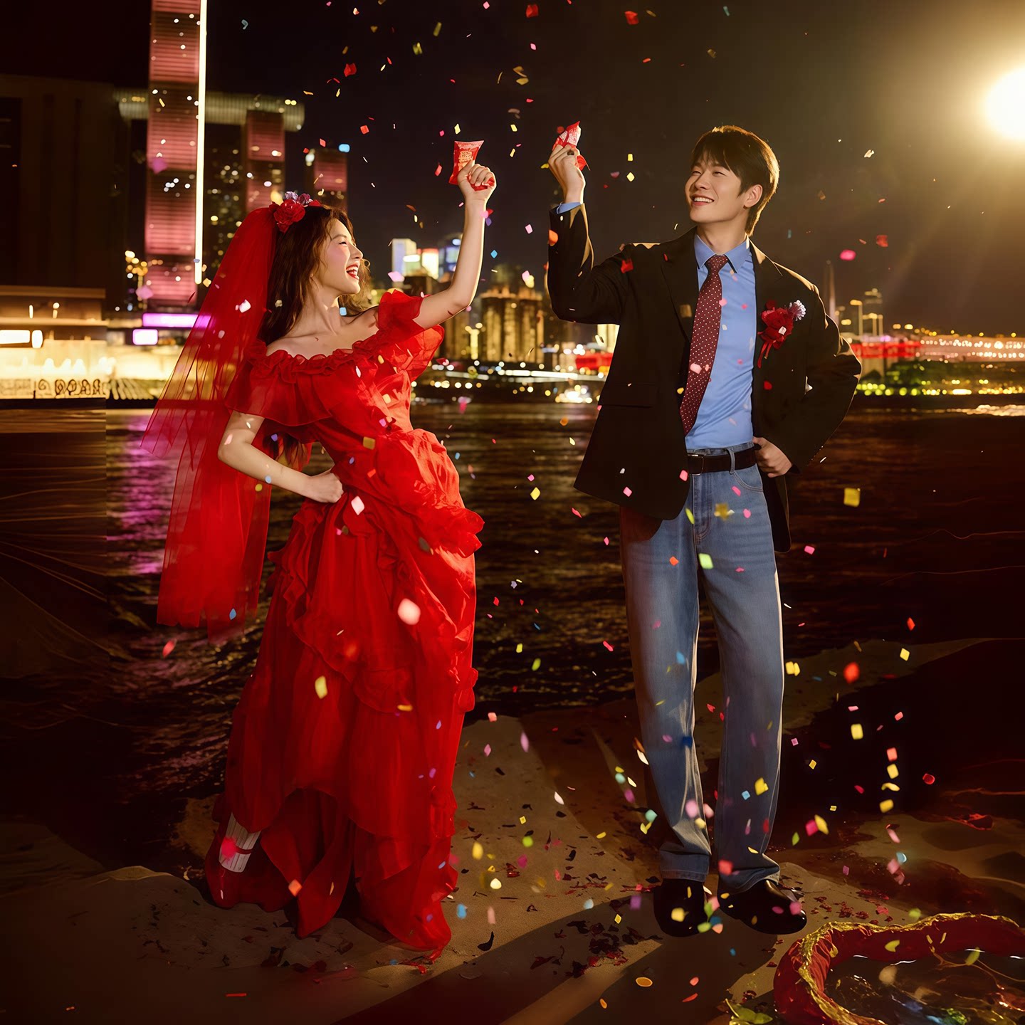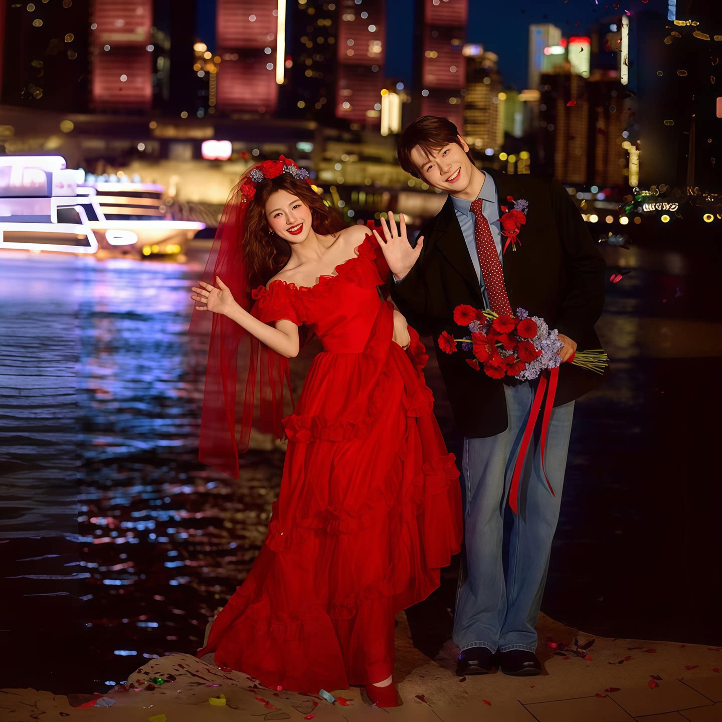 📚 新款影楼拍照摄影红色一字肩主题婚纱女喜嫁风氛围感拖尾礼服旅拍