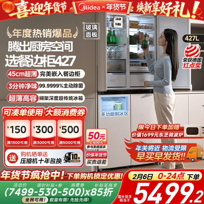 99¥ CZ225 DgtCU9TfmxP¥ https://m.tb.cn/h.7Gpf2WR 美的427餐边柜冰箱45cm超薄零嵌入式家用风冷无霜十字双开四门 --------------------- 【原售价】9,499元 【优惠券】375元 【券后价】9,124元。