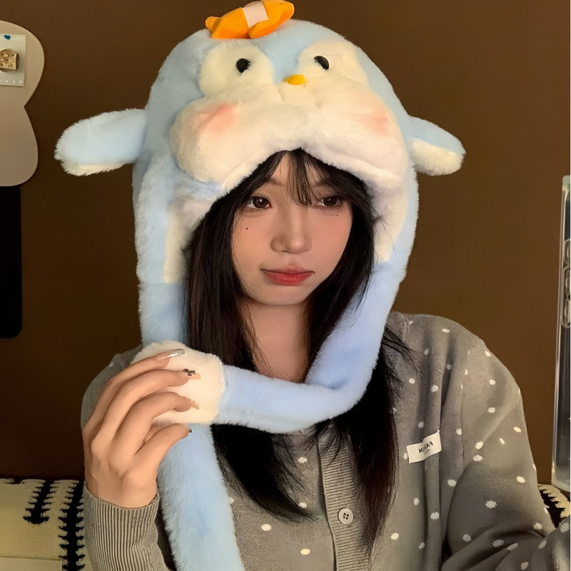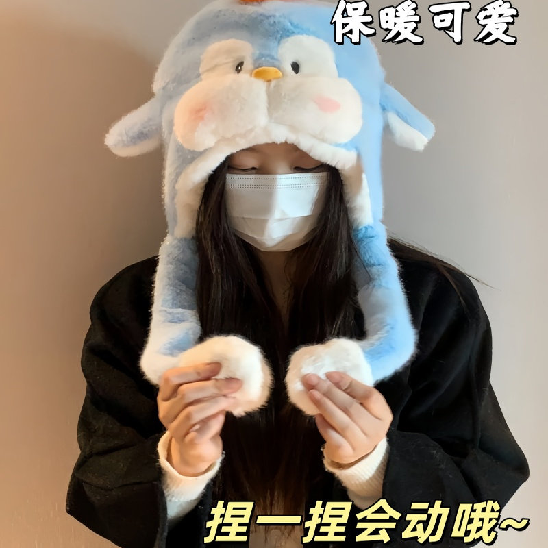 📚 可爱卡通捏一捏企鹅毛绒雷锋帽女秋冬加厚保暖护耳帽子百搭显脸小